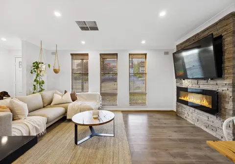 As you enter, you'll discover an open design that effortlessly combines the kitchen, living, and meals area. A electric heater and a feature stone wall add a touch of modern luxury to the space, while the neutral flooring underneath creates a timeless backdrop. With three generously sized bedrooms and an abundant space to relax and enjoy, this home offers ample space for a growing family.