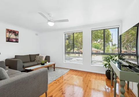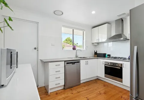 Discover three inviting bedrooms, each adorned with ceiling fans and built-in wardrobes, offering both comfort and convenience. The central bathroom, laundry, and living room upon entry set the stage for a practical and welcoming layout. The open dining and kitchen area is bathed in natural light, thanks to a strategically placed skylight, creating an inviting space for family gatherings.