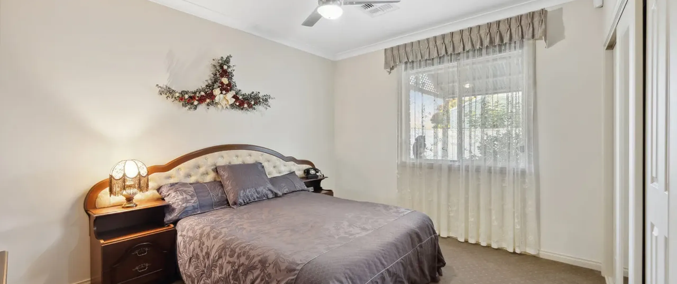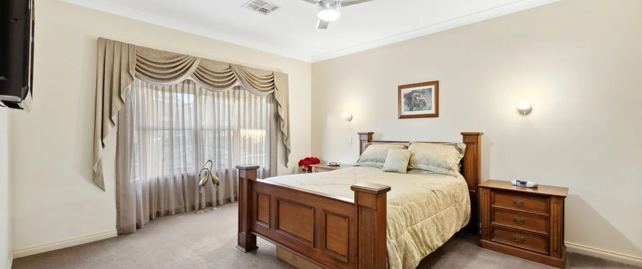 - Master bedroom with a walk-in robe, ensuite, ceiling fan, bay window, roller shutter