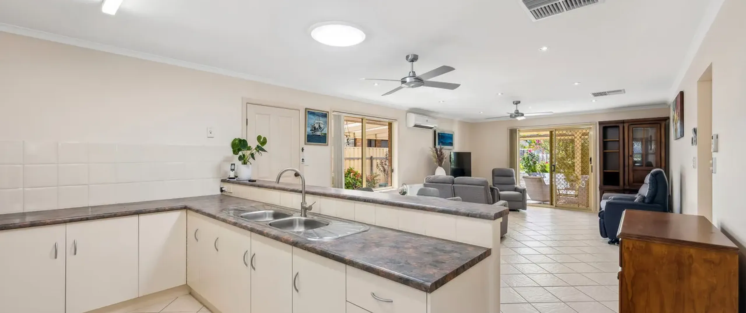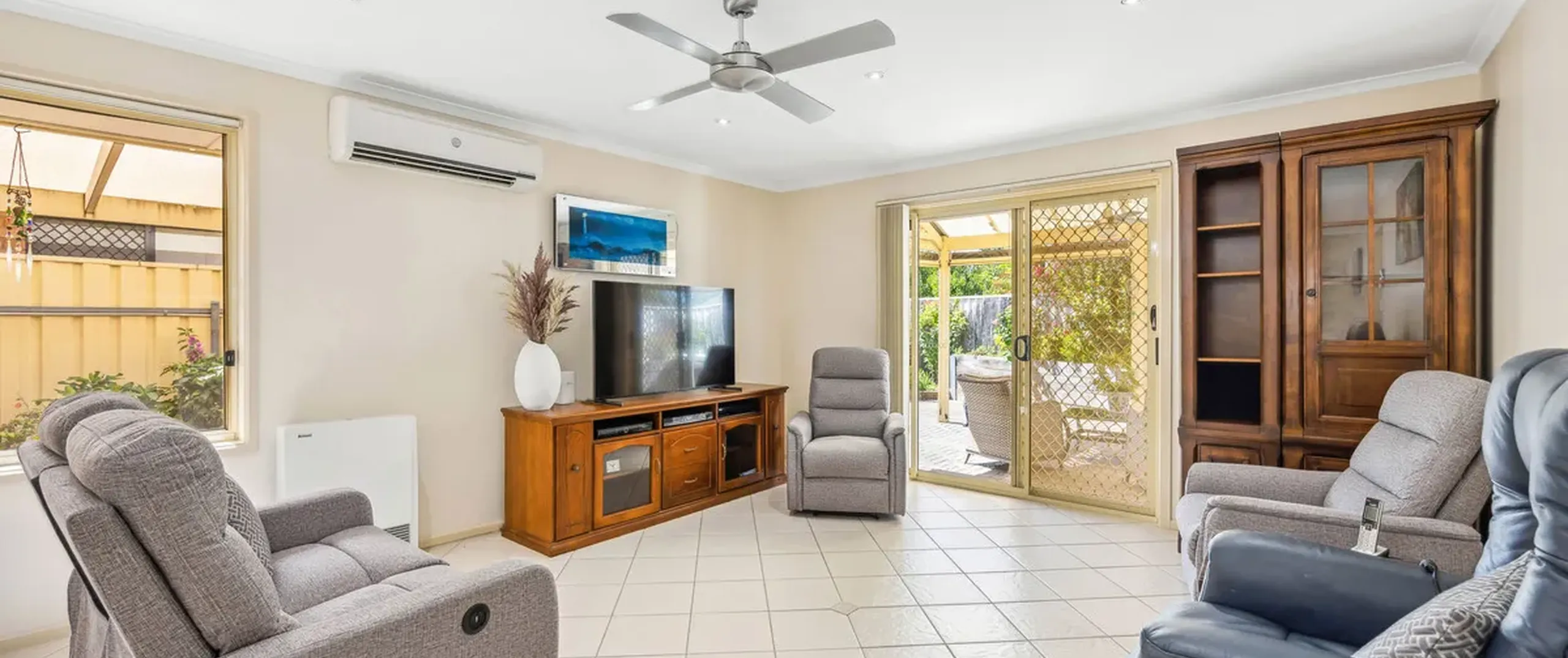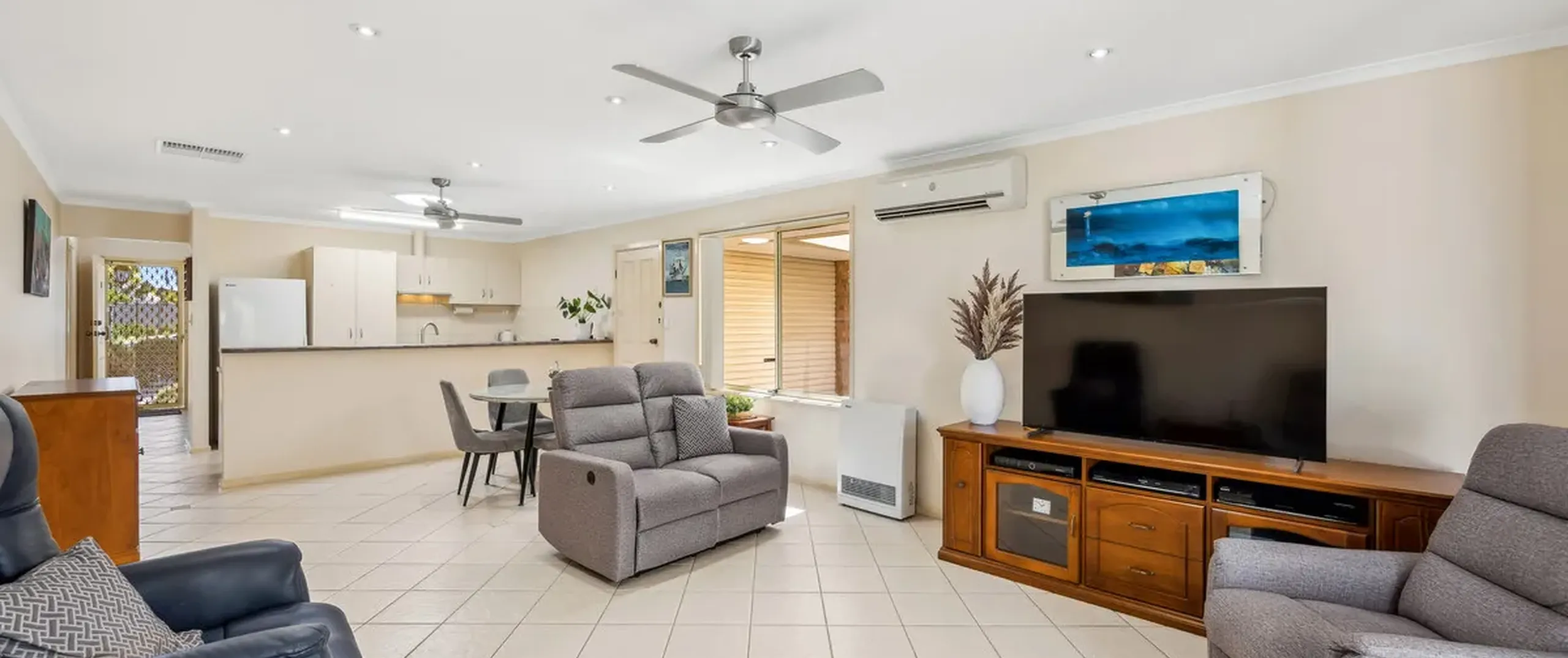 - Open plan living with ceiling fans, split system air-conditioning and gas heater