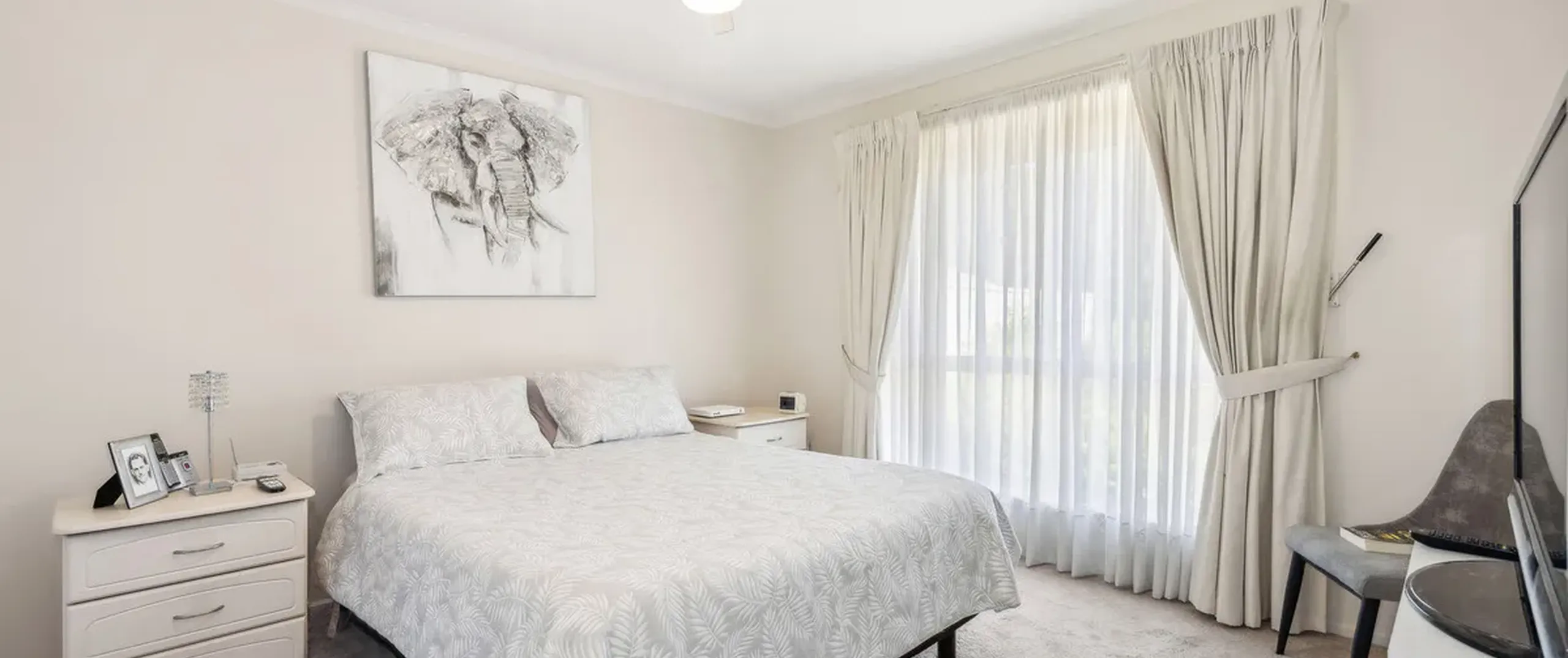 - Master bedroom featuring an ensuite, walk-in robe, ceiling fan and roller shutter