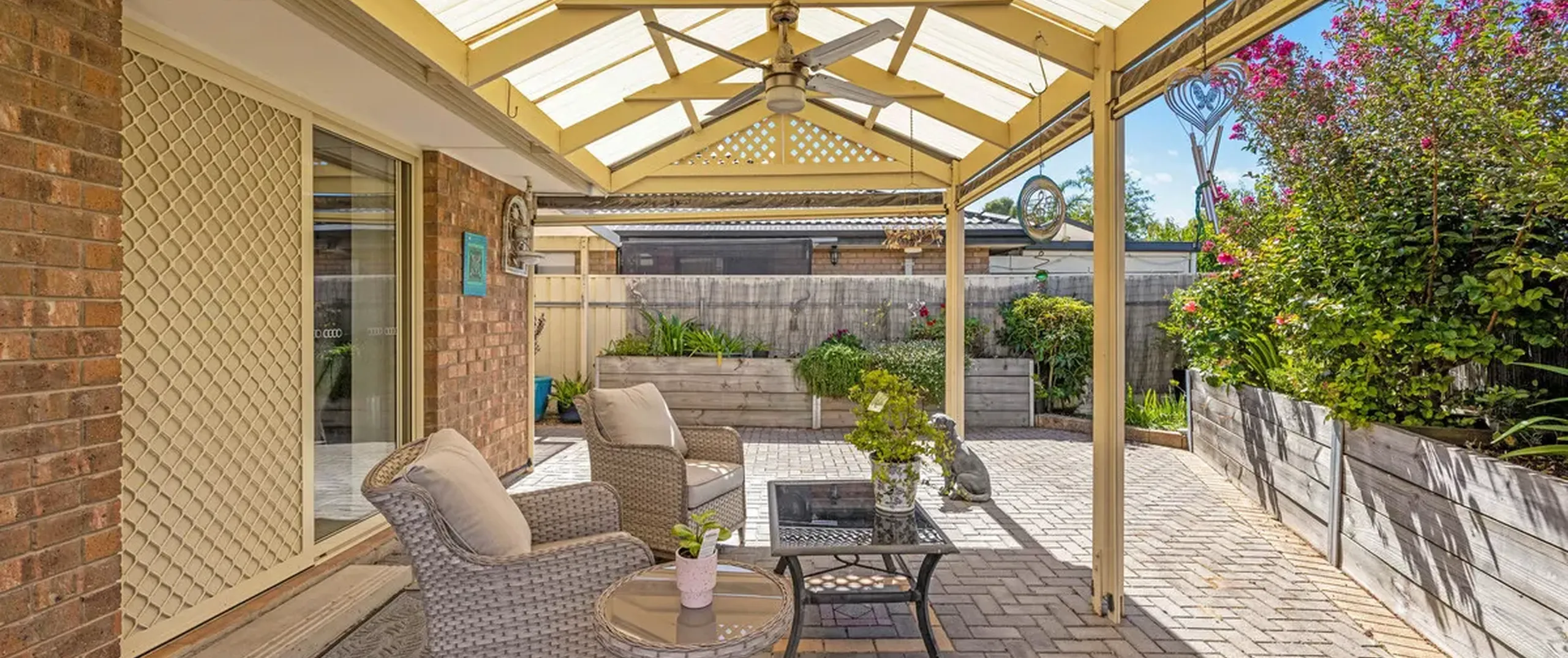 - Pitched roof pergola with a ceiling fan and shade blinds