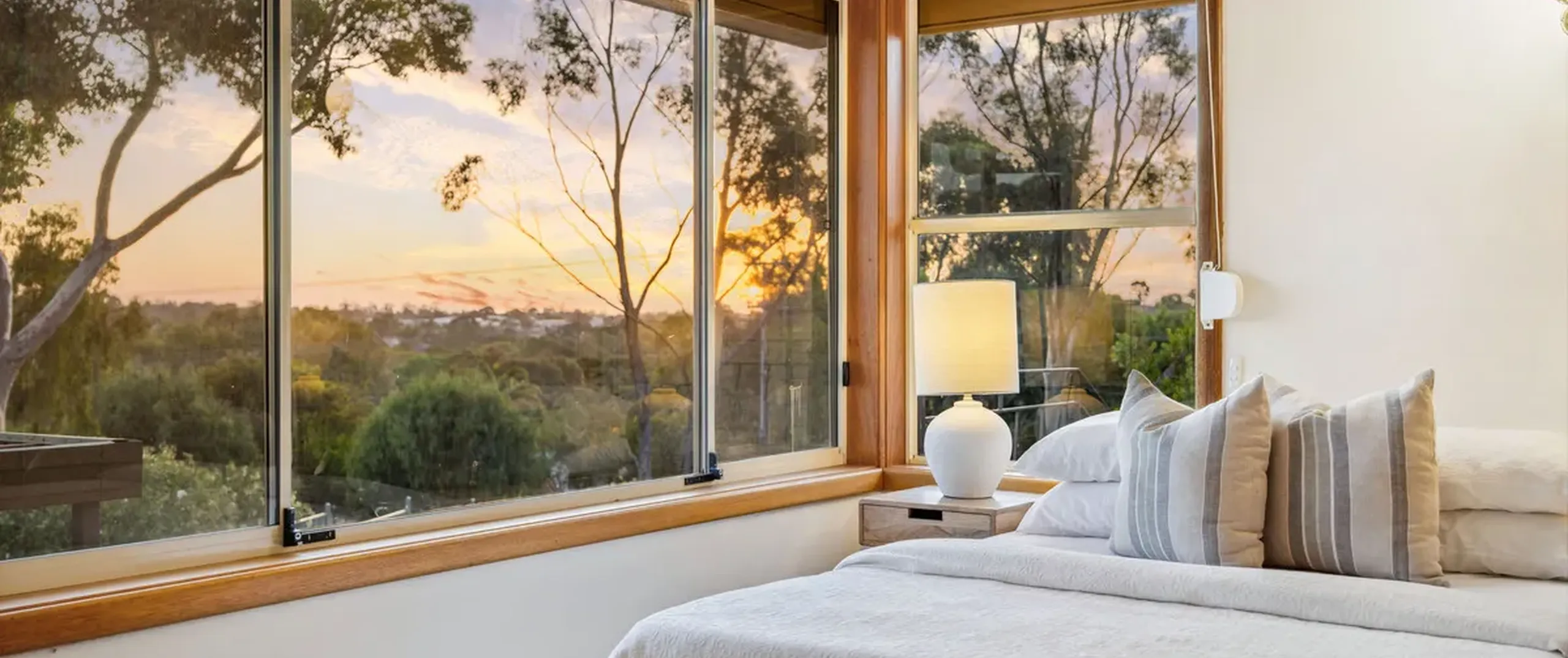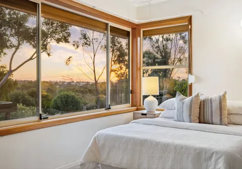 - Spacious master bedroom with built-in robe, ceiling fan and split system air conditioning, featuring hills views