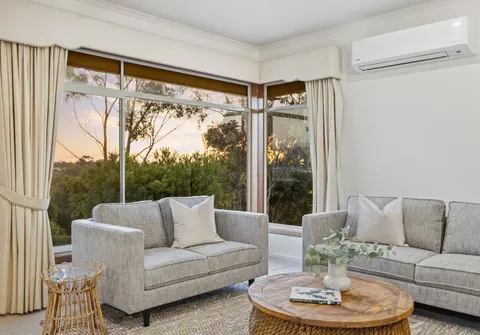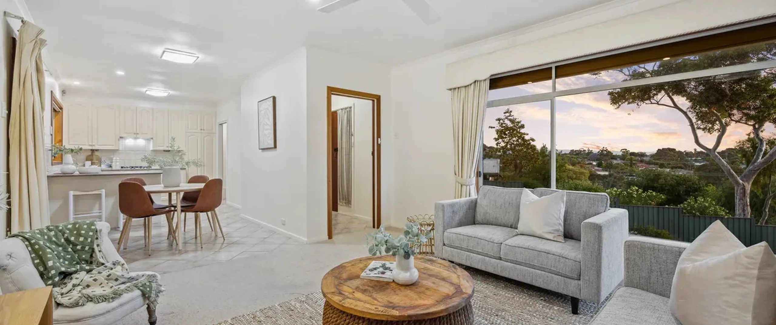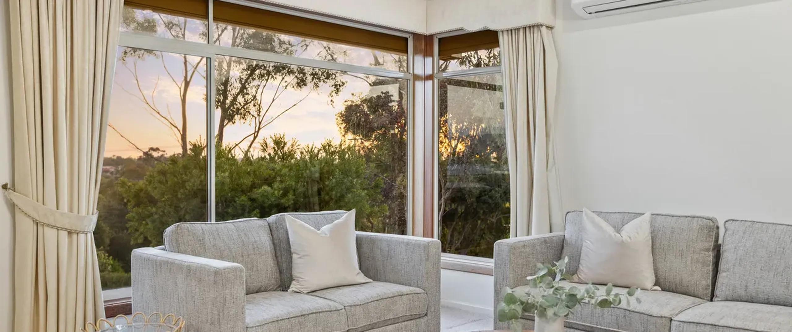 - Light filled lounge room upon entry with split system air conditioning, ceiling fan and stunning hills views