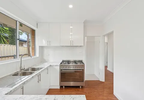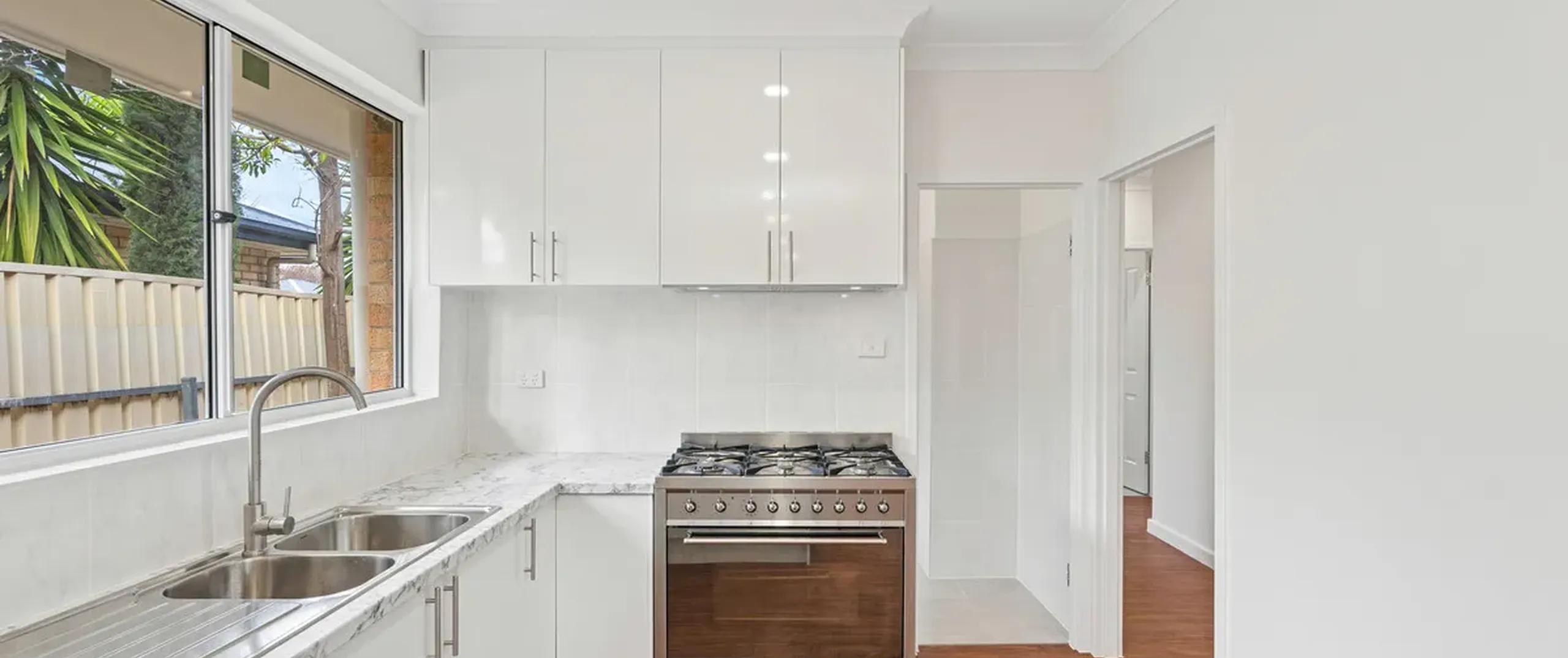 - Stylish, contemporary kitchen featuring a 900mm freestanding cooktop and oven, stainless steel sink and generous cupboard storage