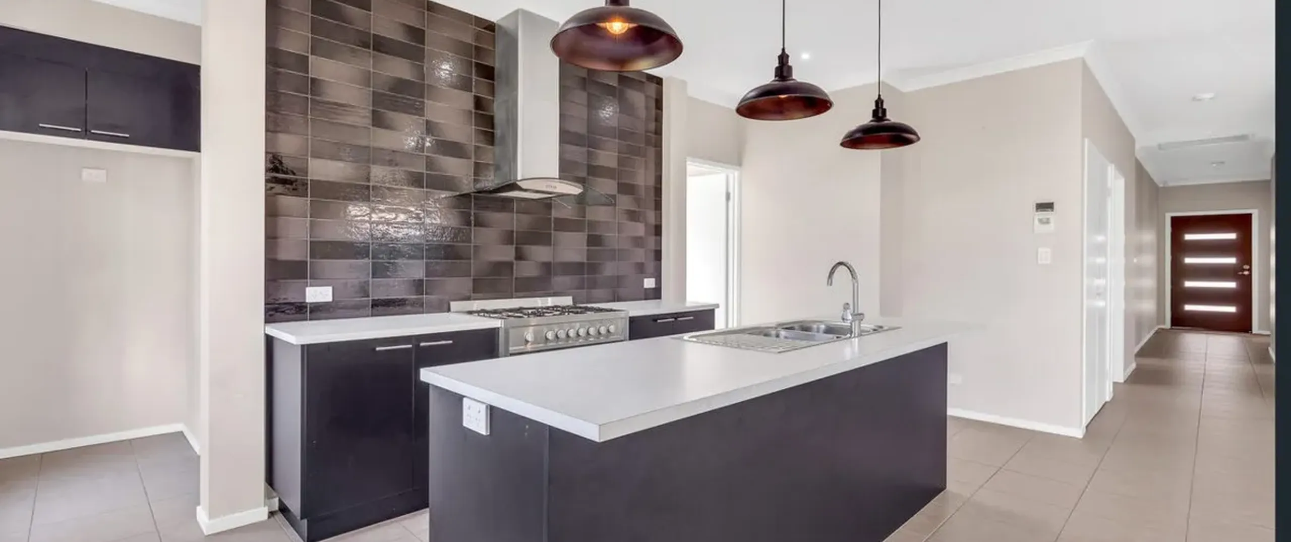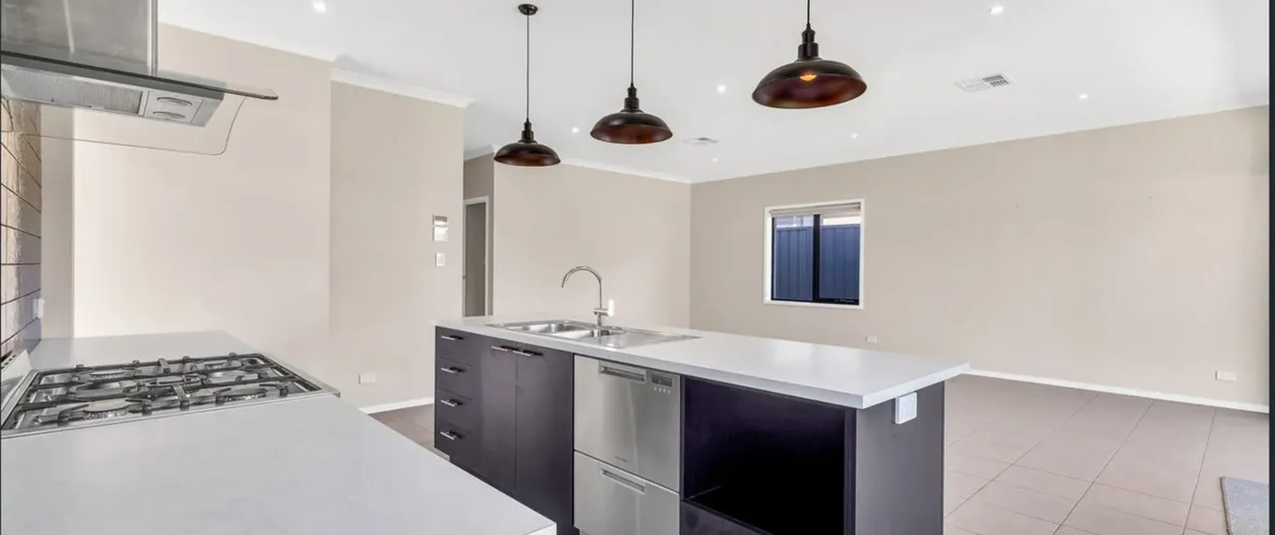- Well-appointed kitchen featuring walk-in pantry, stainless steel appliances including dishwasher, gas cooktop, ample cupboard and bench space and island bench with three beautiful pendant lights