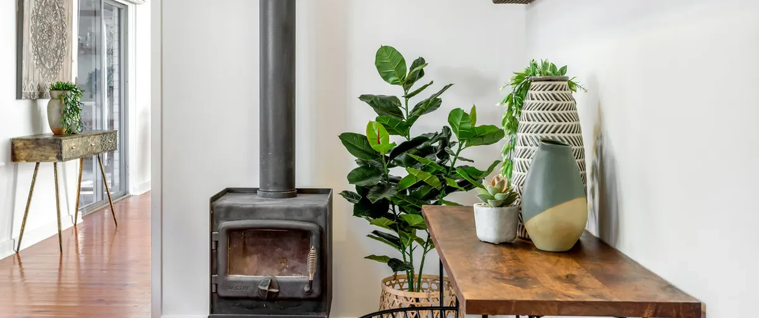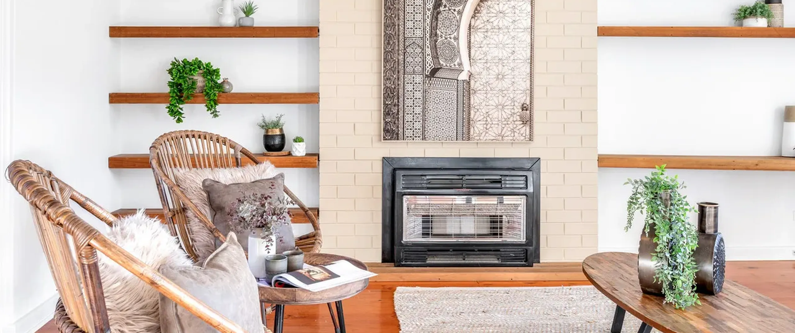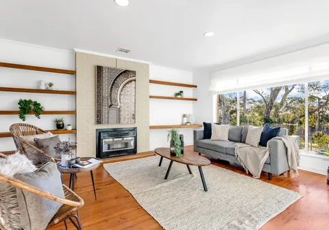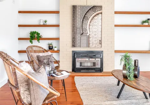 - Spacious lounge with built-in timber shelving, gas heater and an abundance of natural light