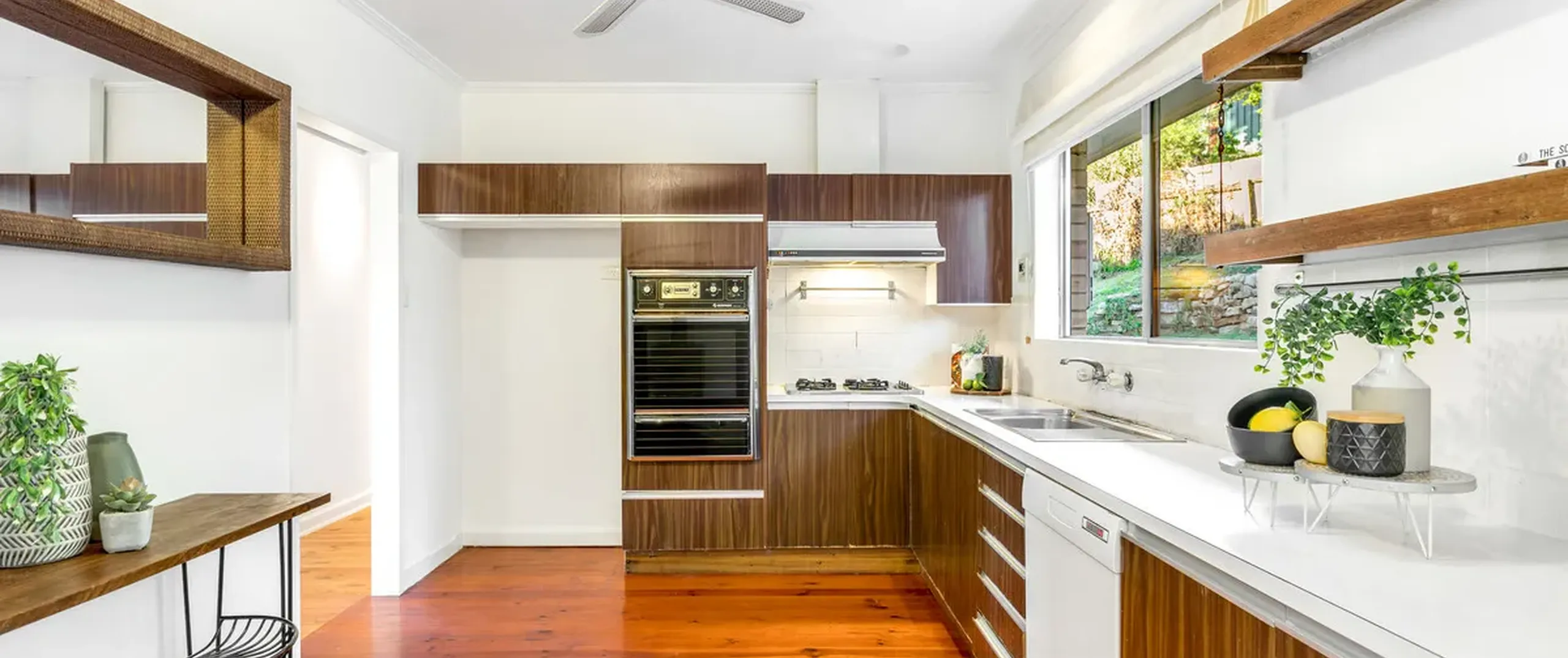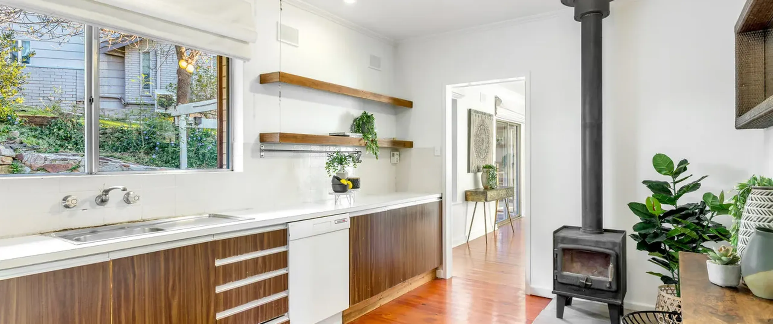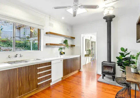 - Practical kitchen with ample cupboard and bench space, ceiling fan, skylight and combustion heater