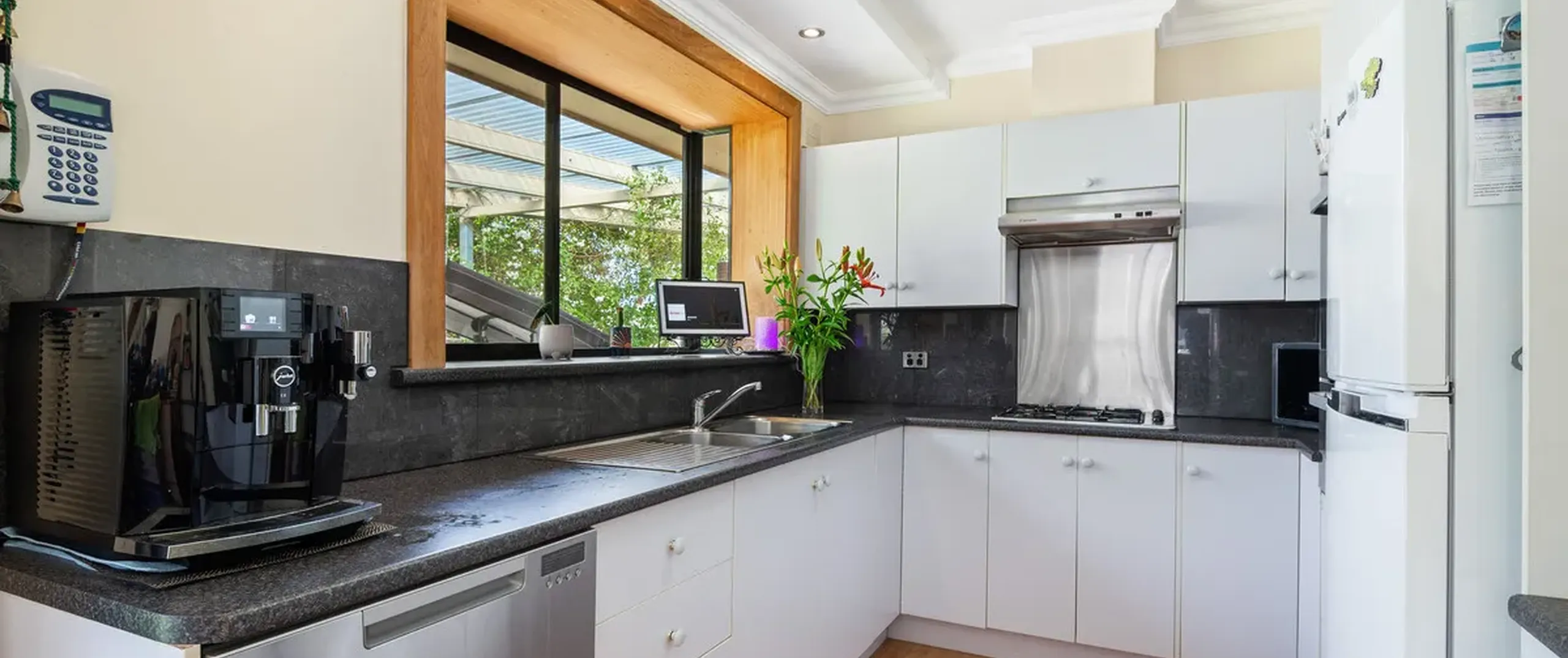 - Timeless kitchen with stainless steel dishwasher, oven and gas cooktop, ample cupboard space and outlook to the backyard