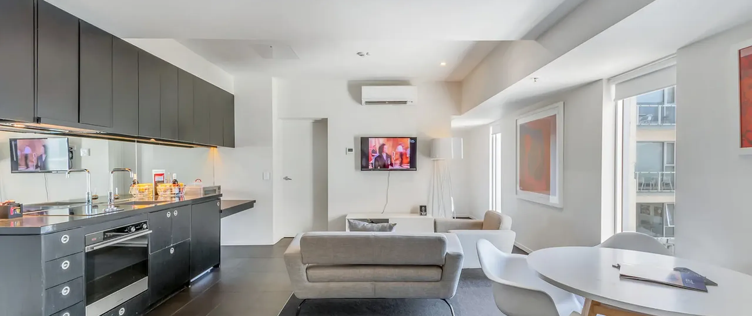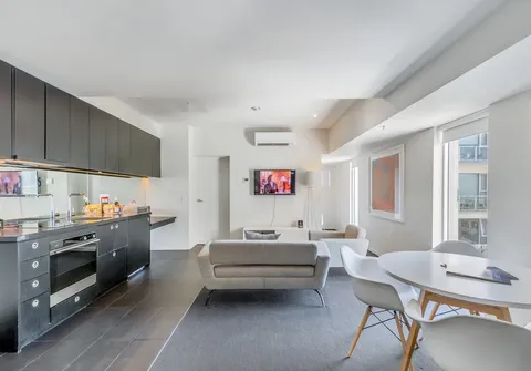 - Stylish kitchen with stainless steel appliances and mirrored splashback