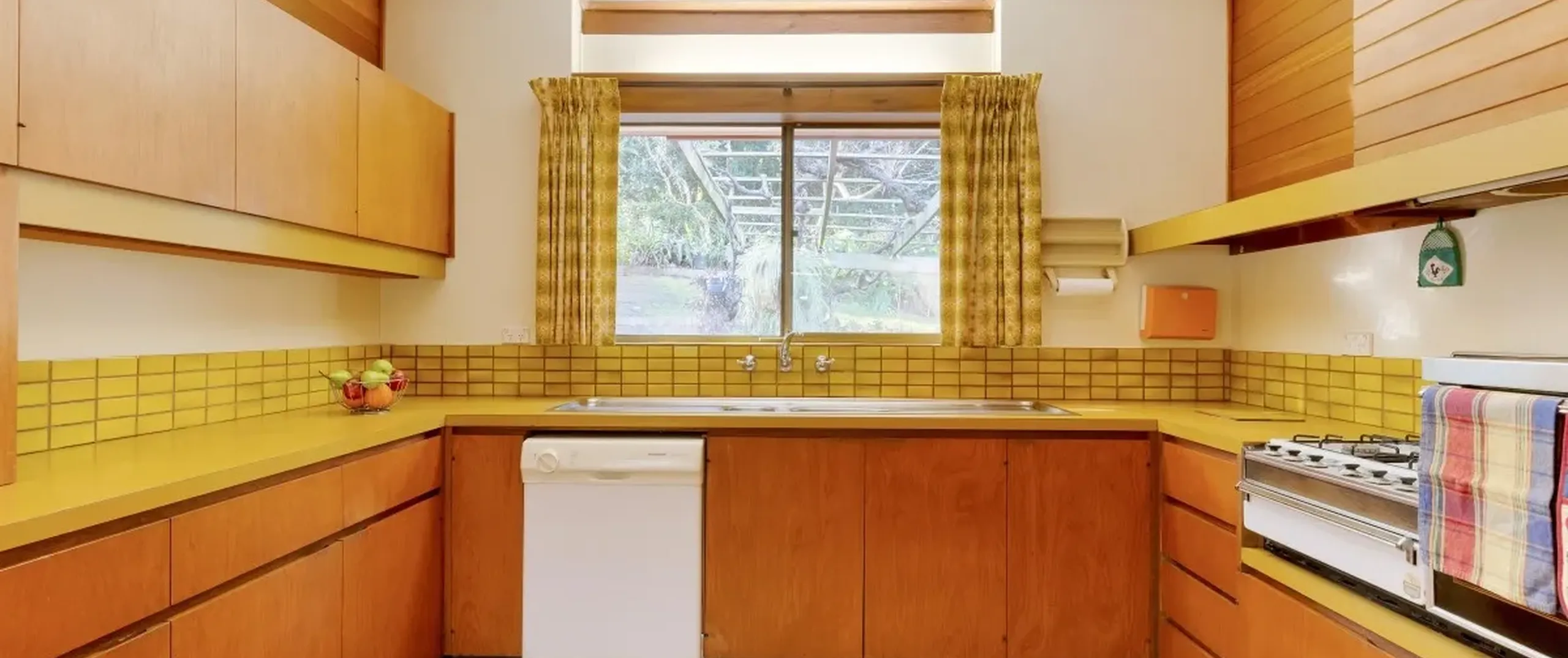 - Original kitchen with gas cooktop, Simpson dishwasher, double sink and breakfast bar