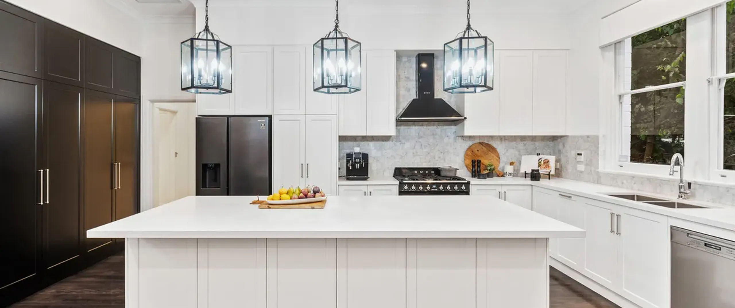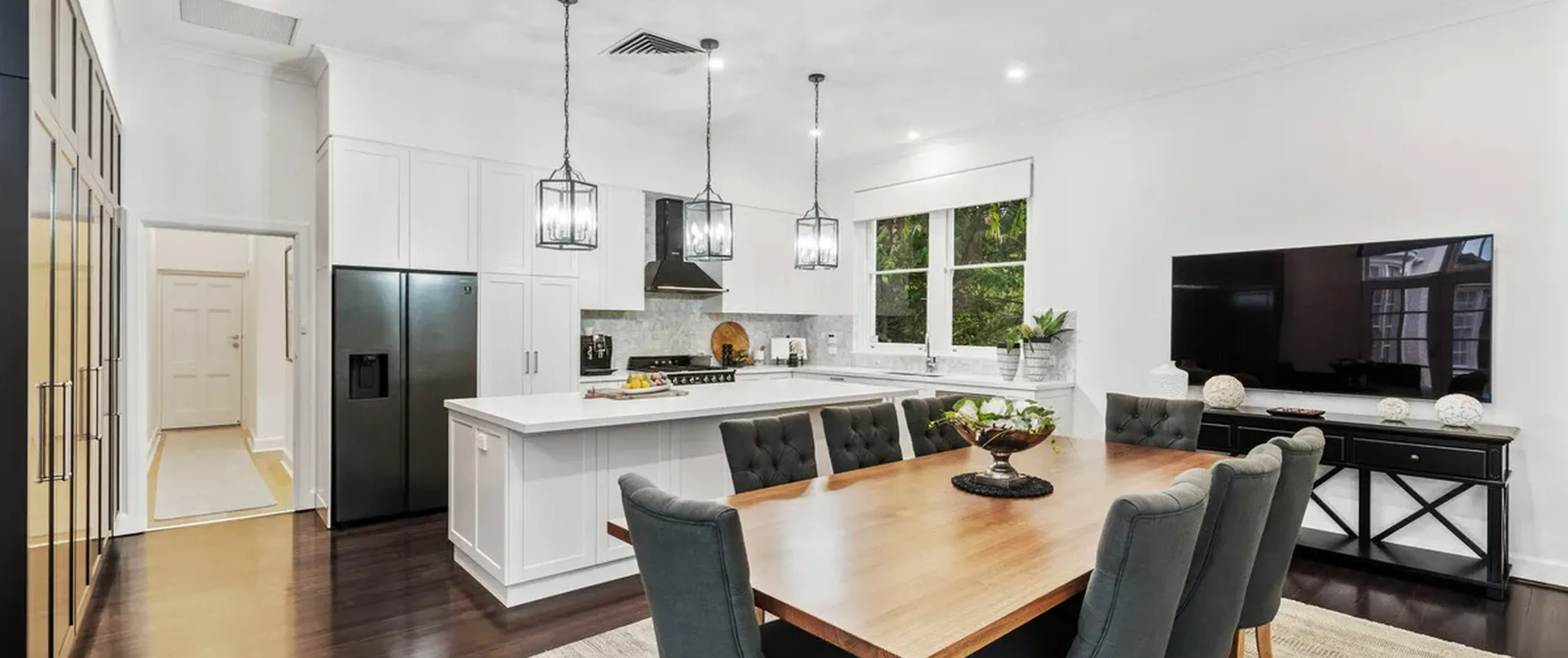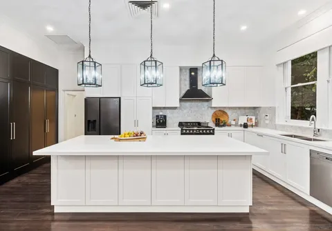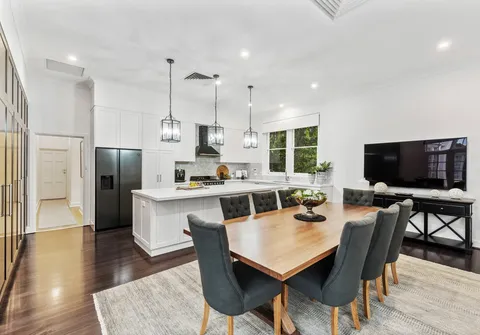 Step beyond the commanding façade into a gracious reception hall featuring soaring ceilings and a grand staircase. Guests may be formally received in the adjacent study or expansive lounge room with charming log-burning fireplace. The corresponding formal dining room complete with elegant bow window is within immediate access of an impressive entertainer’s kitchen. A showpiece of custom workmanship, the kitchen is adorned with an Italian marble mosaic splashback, 40mm stone benchtops, and spotted gum hardwood flooring underfoot. Brand new appliances include a Smeg oven, stovetop and rangehood, and Miele dishwasher.