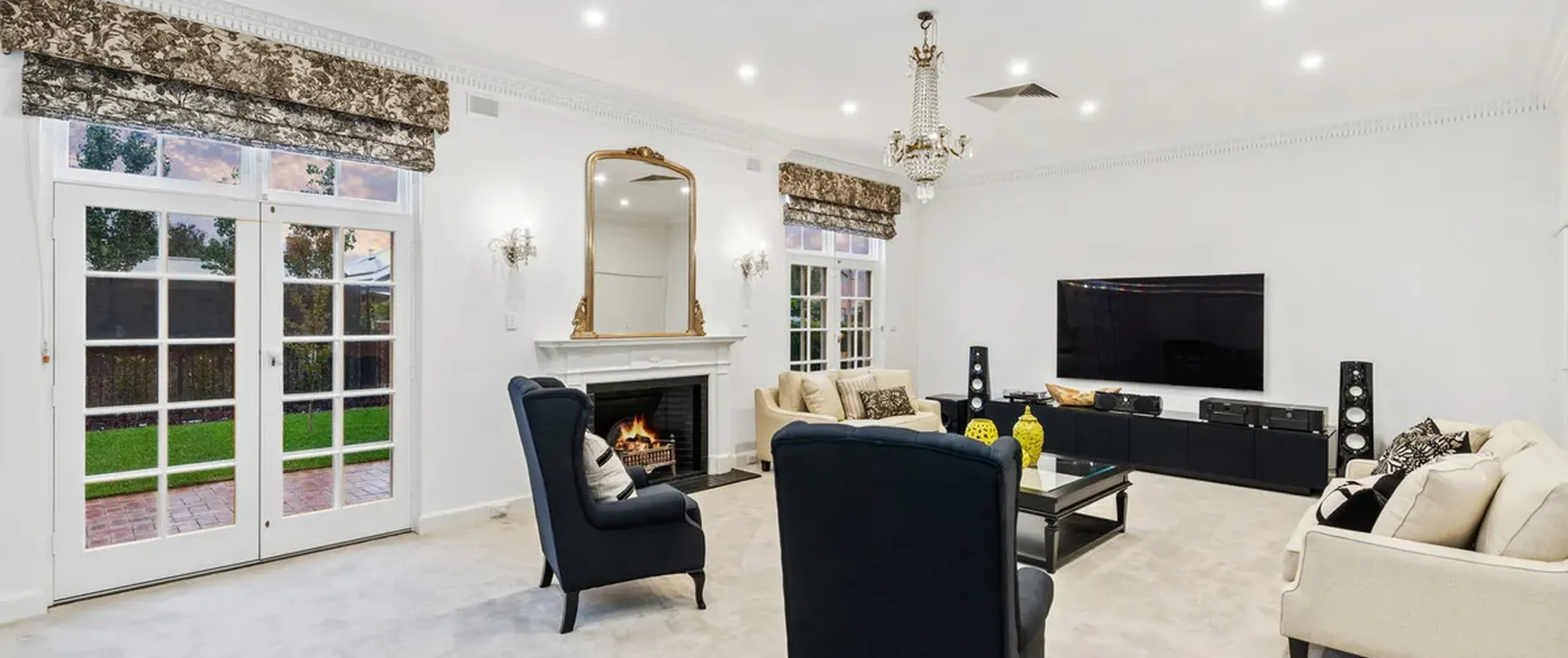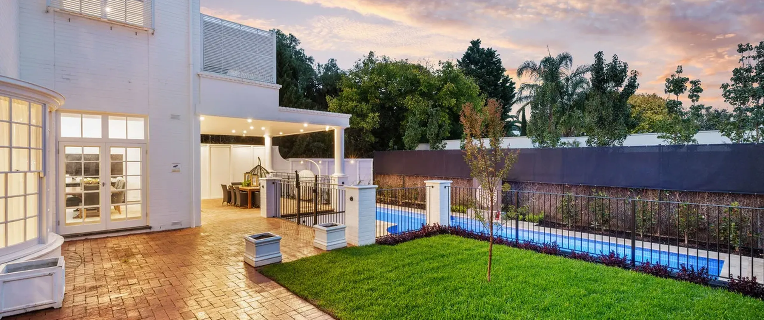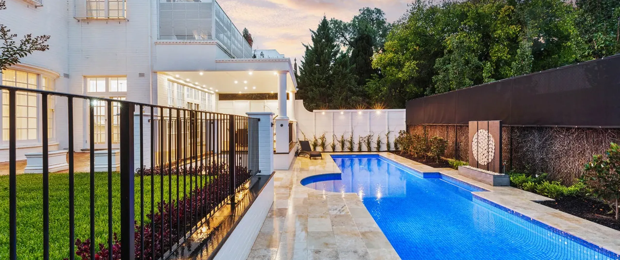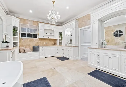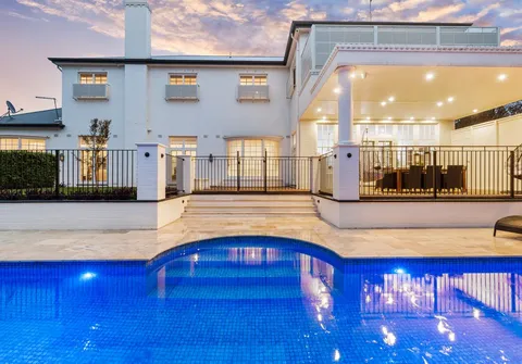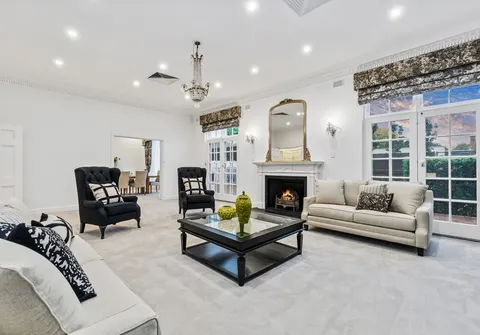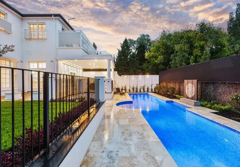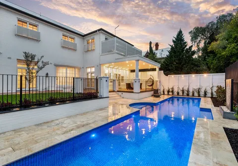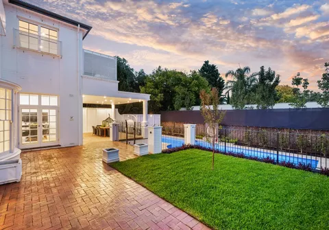 French doors connect both the formal and informal living areas to the expansive outdoor terraces for a myriad of indoor-outdoor entertaining options. The covered patio presents a picturesque setting for long lunches, with a spectacular outlook to the newly installed fifteen-metre designer swimming pool, which is framed by stunning wet-laid Turkish travertine and poised for year-round swimming comfort with prized gas and electric heating.