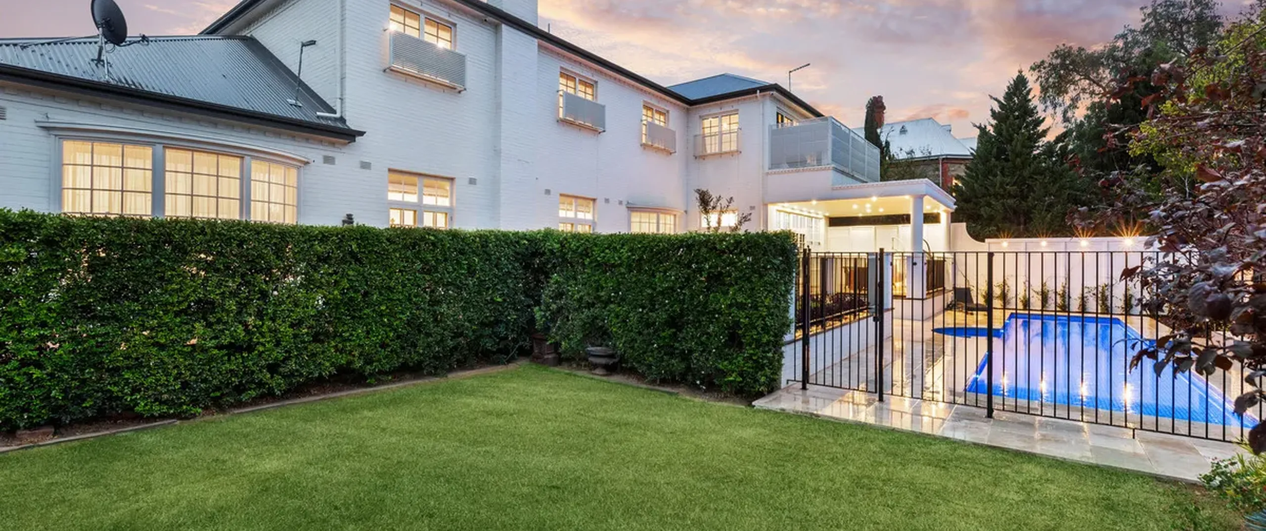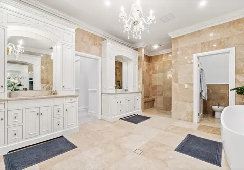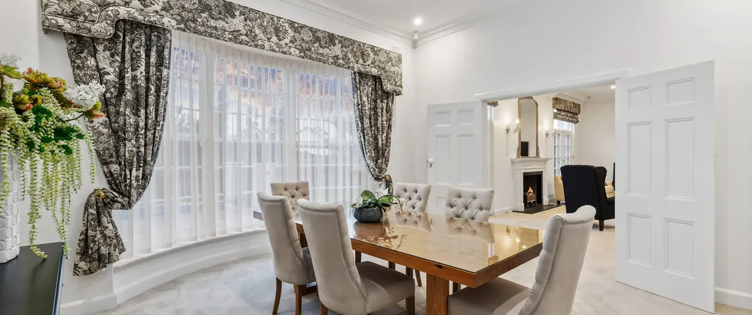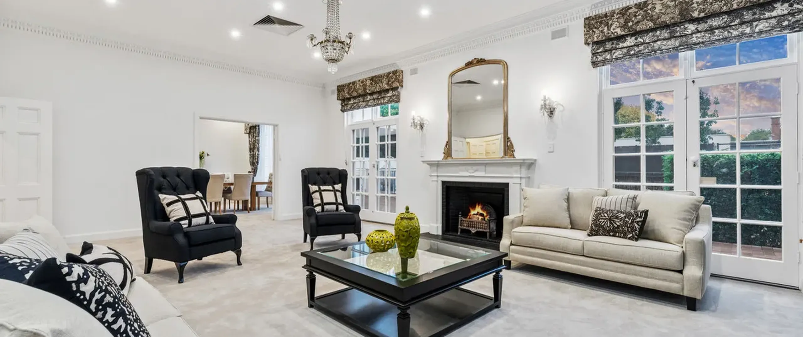 French doors connect both the formal and informal living areas to the expansive outdoor terraces for a myriad of indoor-outdoor entertaining options. The covered patio presents a picturesque setting for long lunches, with a spectacular outlook to the newly installed fifteen-metre designer swimming pool, which is framed by stunning wet-laid Turkish travertine and poised for year-round swimming comfort with prized gas and electric heating.