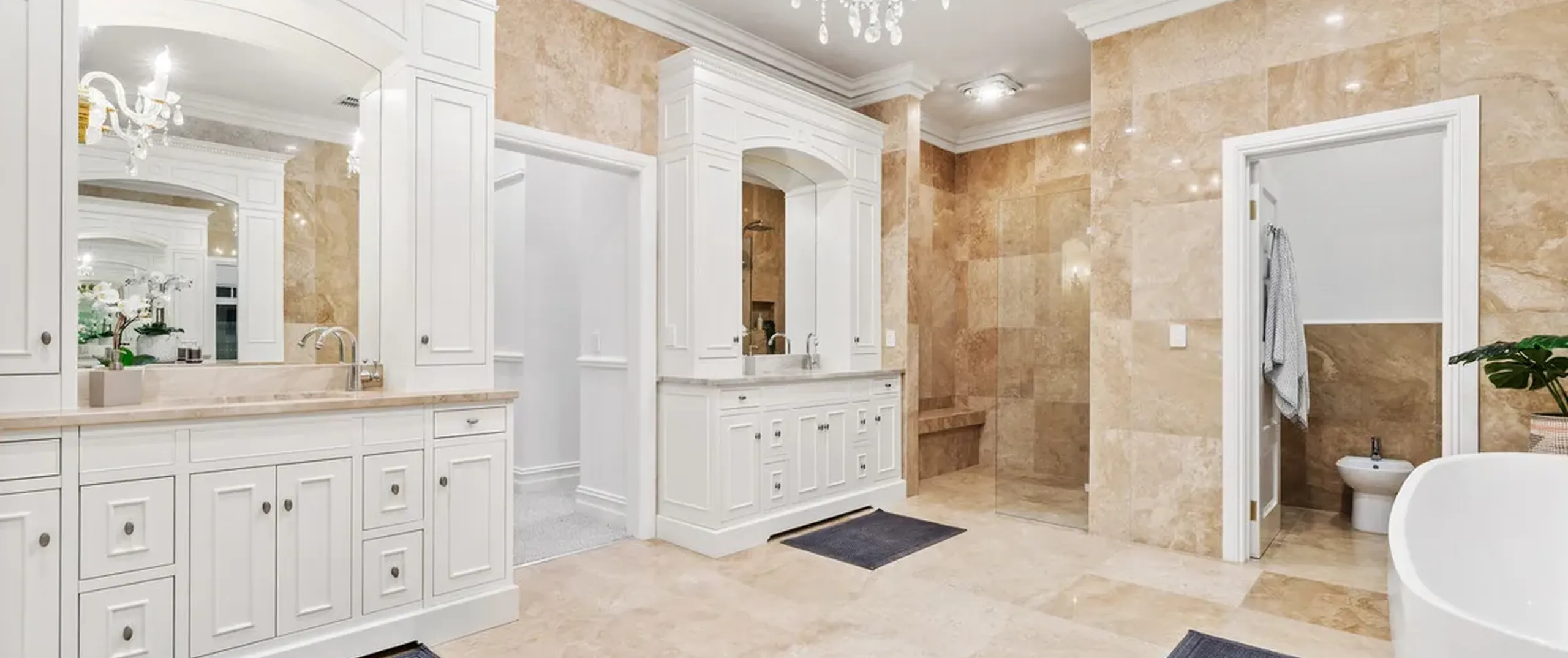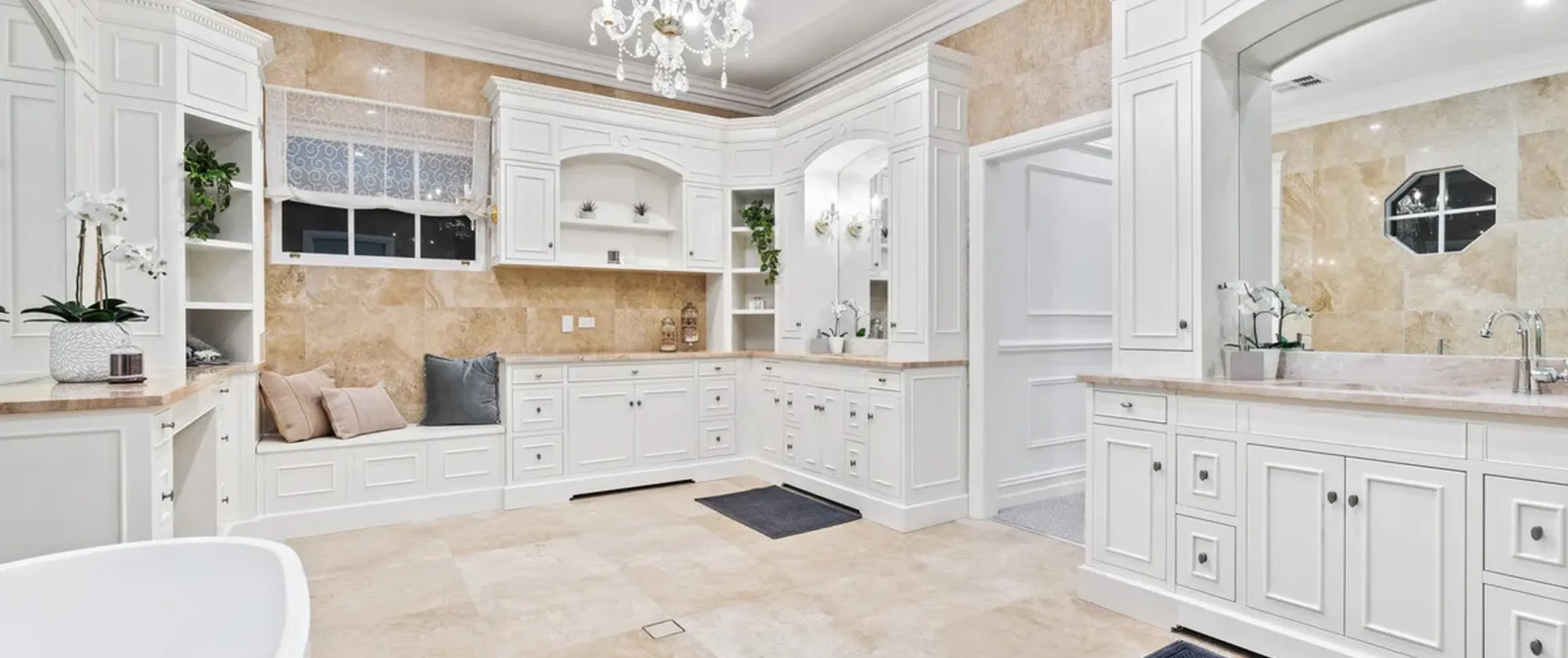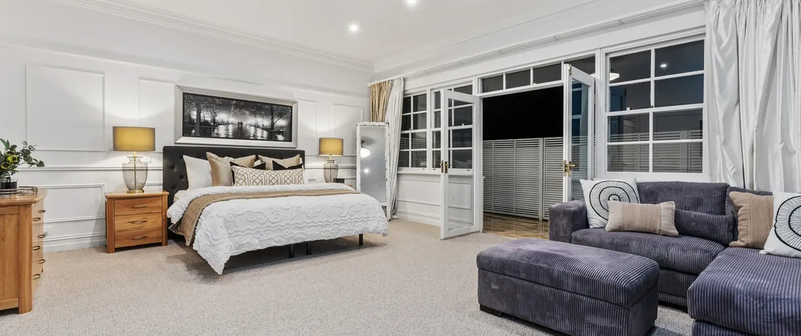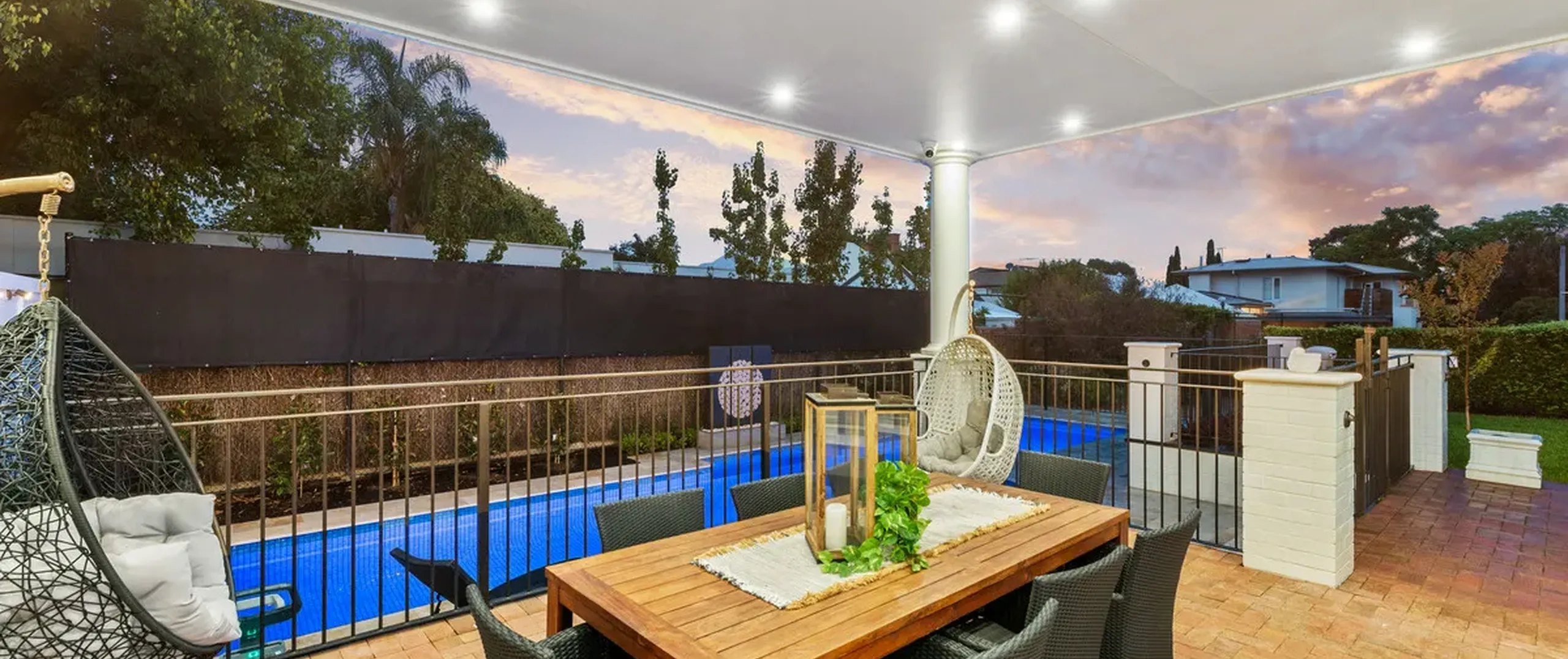 French doors connect both the formal and informal living areas to the expansive outdoor terraces for a myriad of indoor-outdoor entertaining options. The covered patio presents a picturesque setting for long lunches, with a spectacular outlook to the newly installed fifteen-metre designer swimming pool, which is framed by stunning wet-laid Turkish travertine and poised for year-round swimming comfort with prized gas and electric heating.