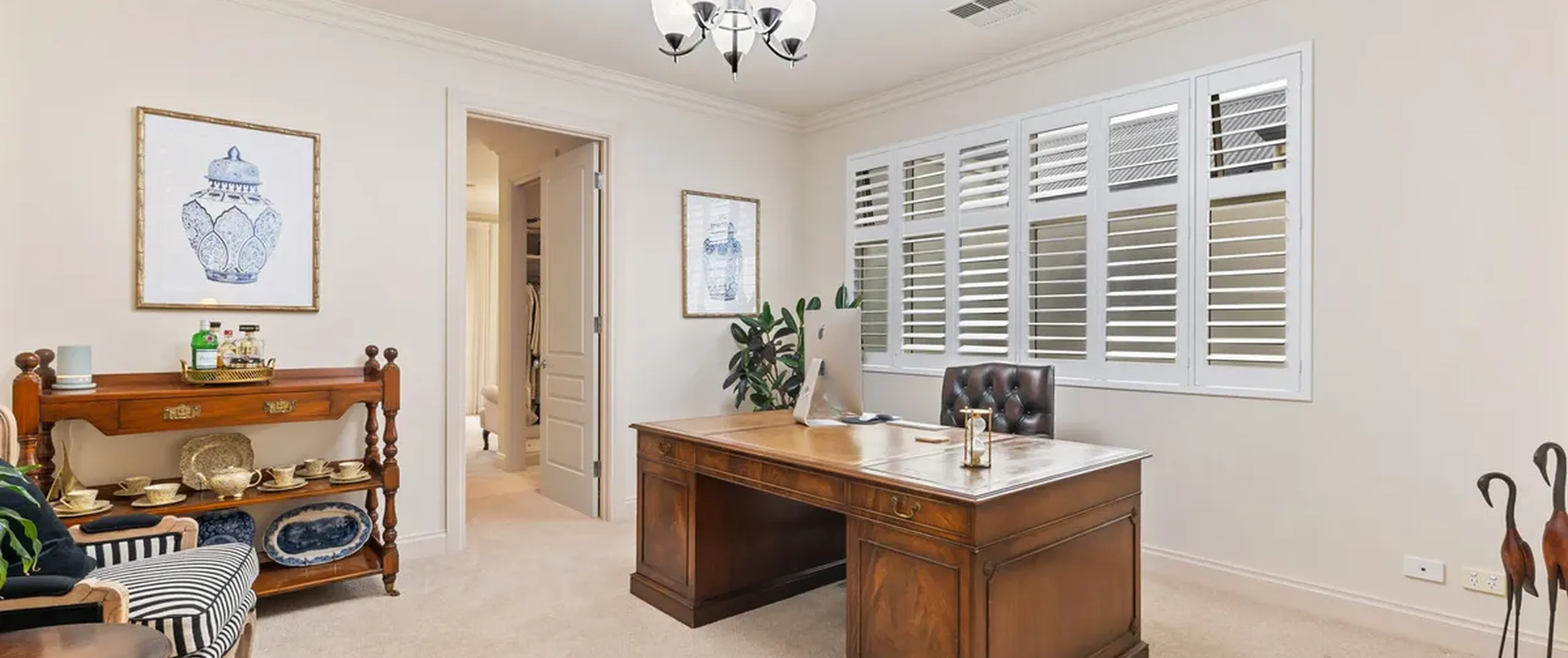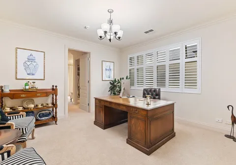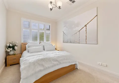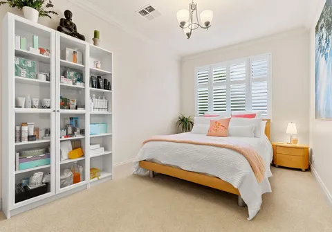 Comfort and convenience have been given equal consideration in the guest bedrooms, appointed with built-in robes and easy access to the main bathroom. Plantation shutters complement the windows, while a private retreat and home office complete the level.