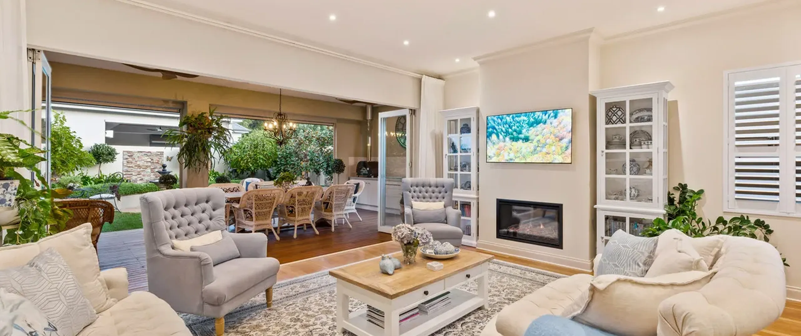 - Open-plan kitchen and family room featuring a gas fireplace and bi-fold doors for seamless flow to the alfresco