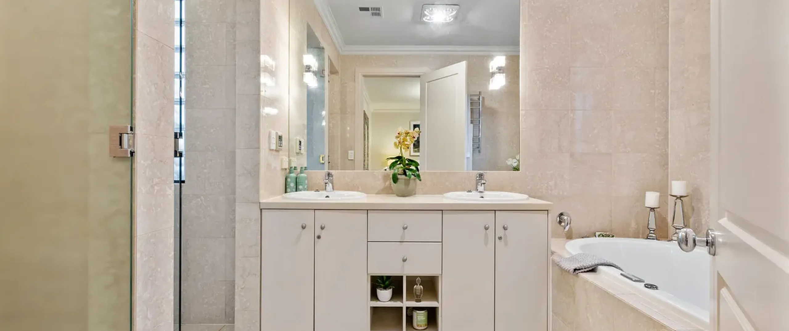 - Gleaming main bathroom featuring floor to ceiling marble tiles, double vanity and separate toilet