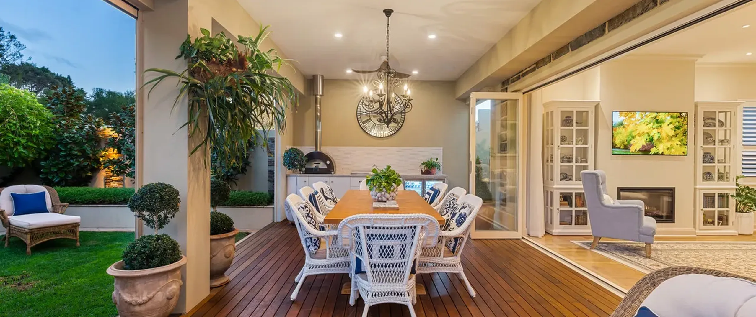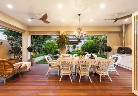 - Showstopping merbau hardwood decked alfresco, featuring two ceiling fans, cafe blinds, built-in speakers, an outdoor kitchen with fridge, built-in mains gas teppanyaki style BBQ and pizza oven - a true entertainer’s haven