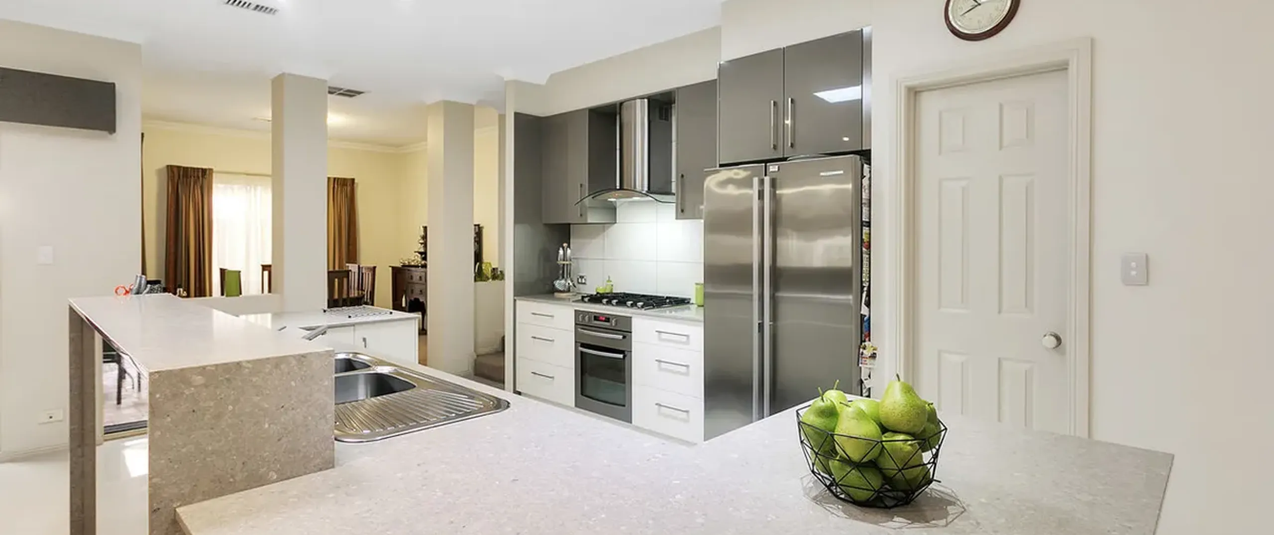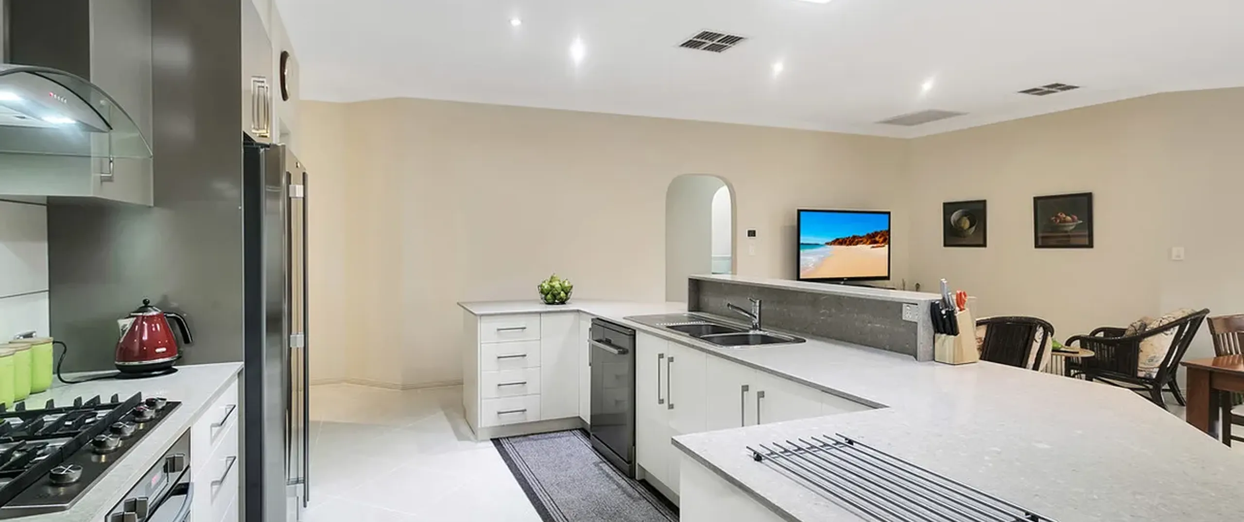 - Modern kitchen with Caesar Stone benches, gas cooktop, dishwasher, walk-in pantry and ample bench and cupboard space
