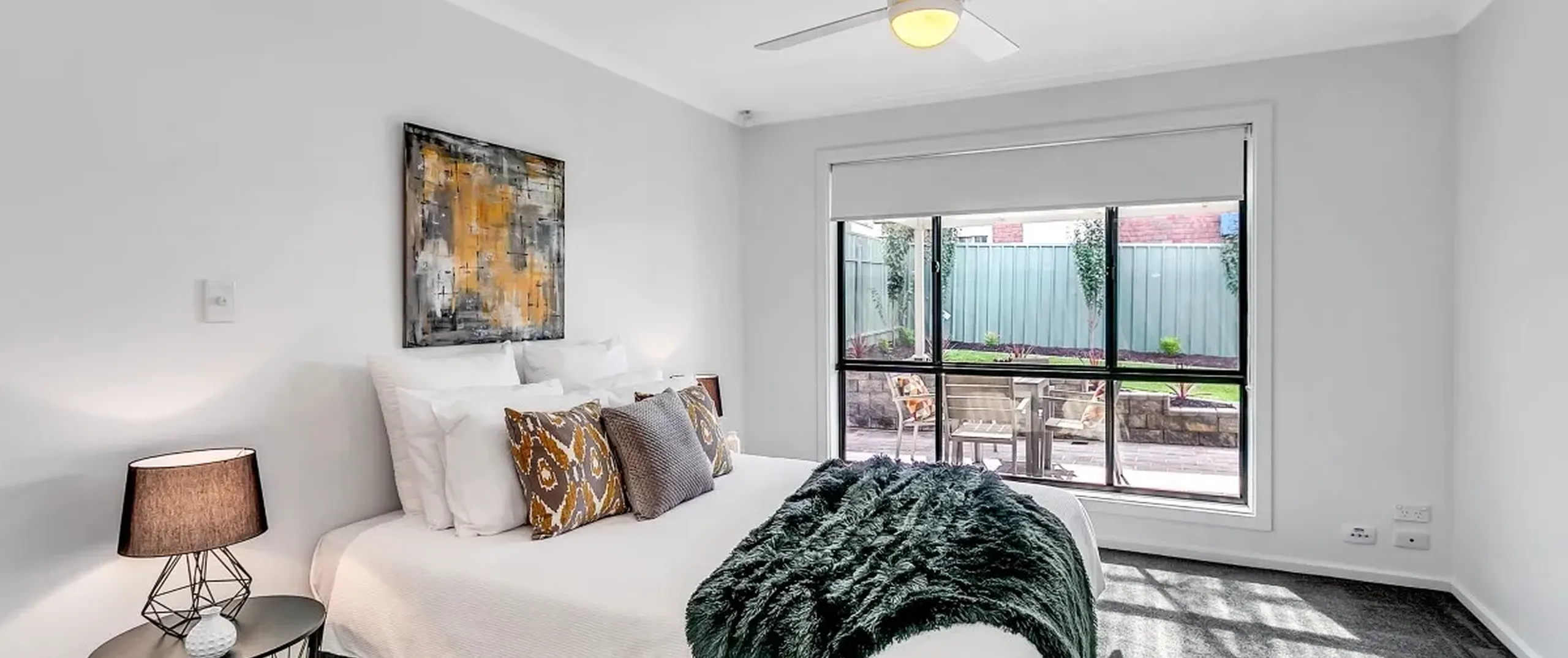 - Large master bedroom with ceiling fan and walk-in robe