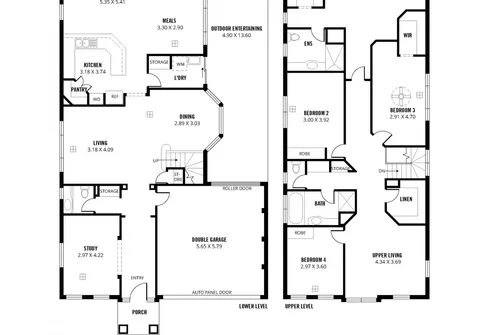 - Double garage with built-in shelving, automatic panel-lift door, direct internal entry and drive-through roller door access to rear