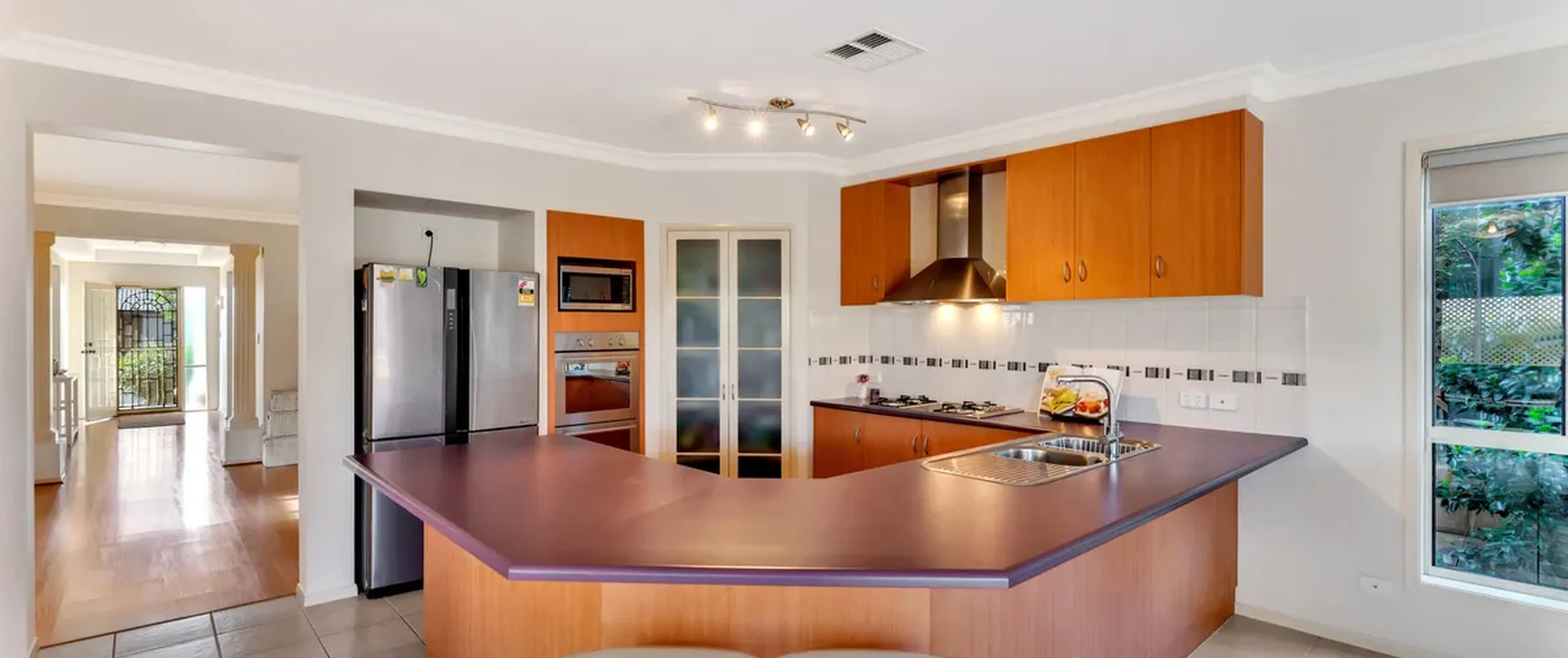 - Modern kitchen with gas cooktop, ample bench and cupboard space, breakfast bar and walk-in pantry