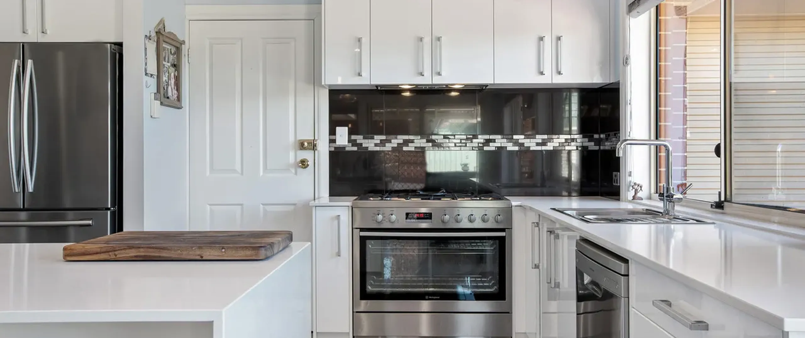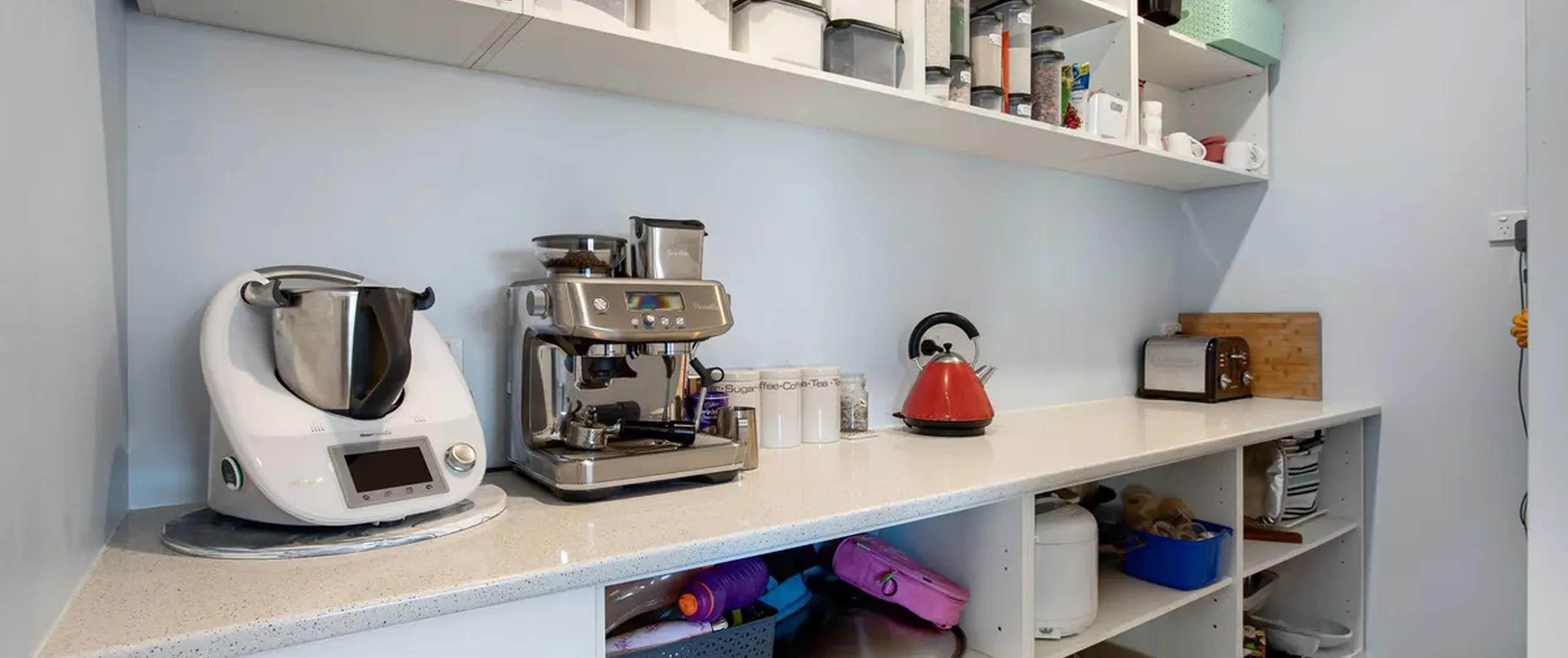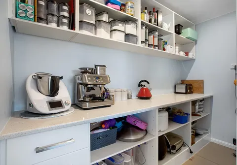 - Stylish kitchen with waterfall stone bench top, stainless steel appliances including dishwasher and gas cooktop, island bench with breakfast bar, and walk-in pantry