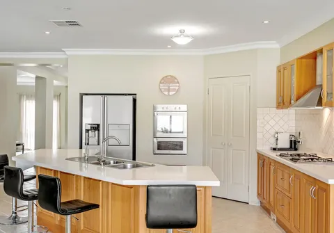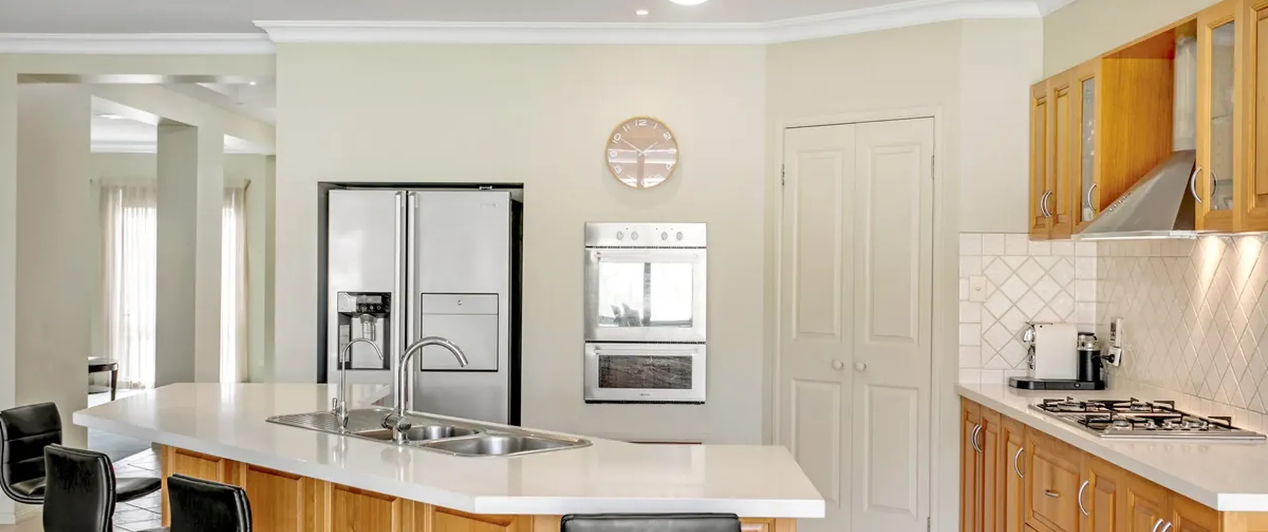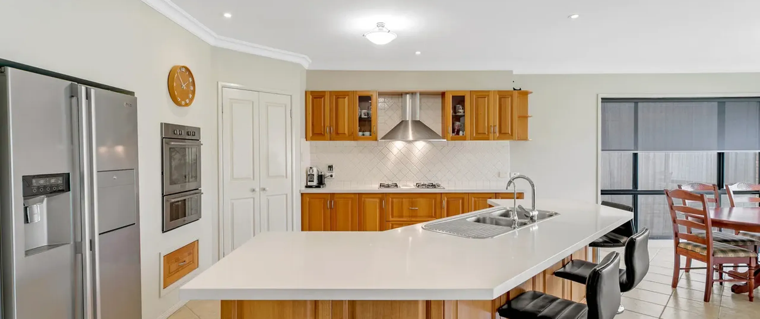 - Practical timber kitchen with breakfast bar, ample cupboard and bench space and stainless steel appliances including 900mm gas cooktop and dishwasher