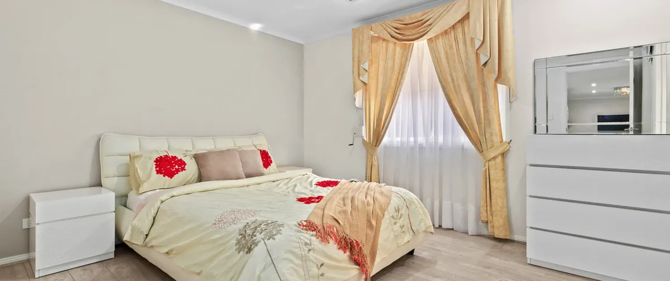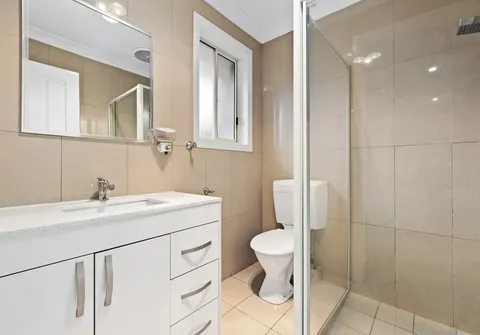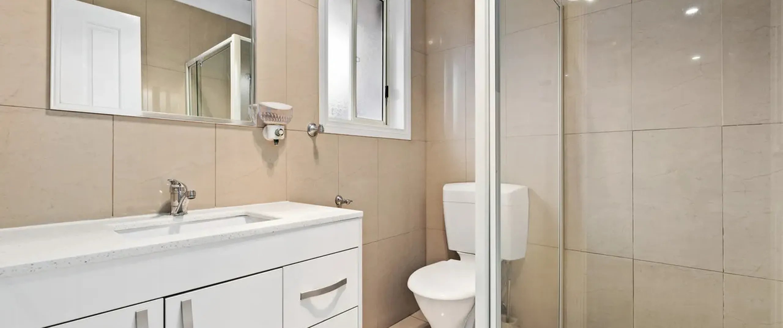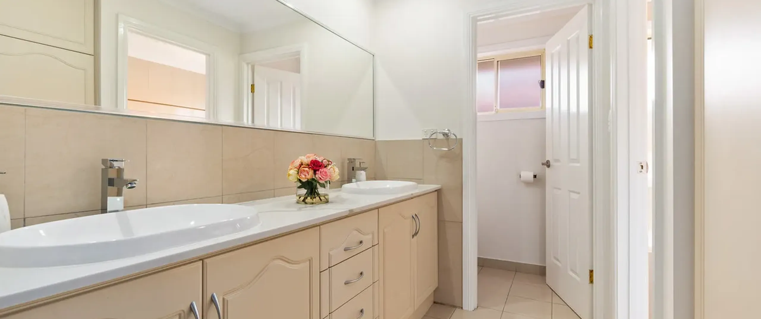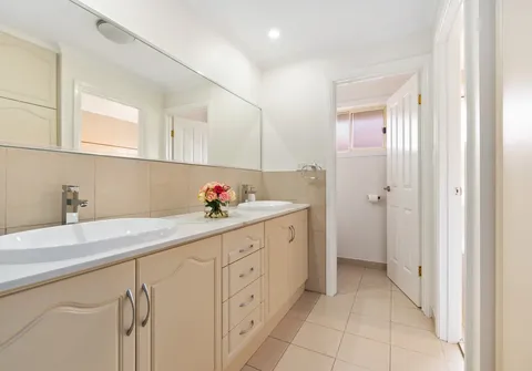 - Separate vanity with double basins and built-in linen cupboard