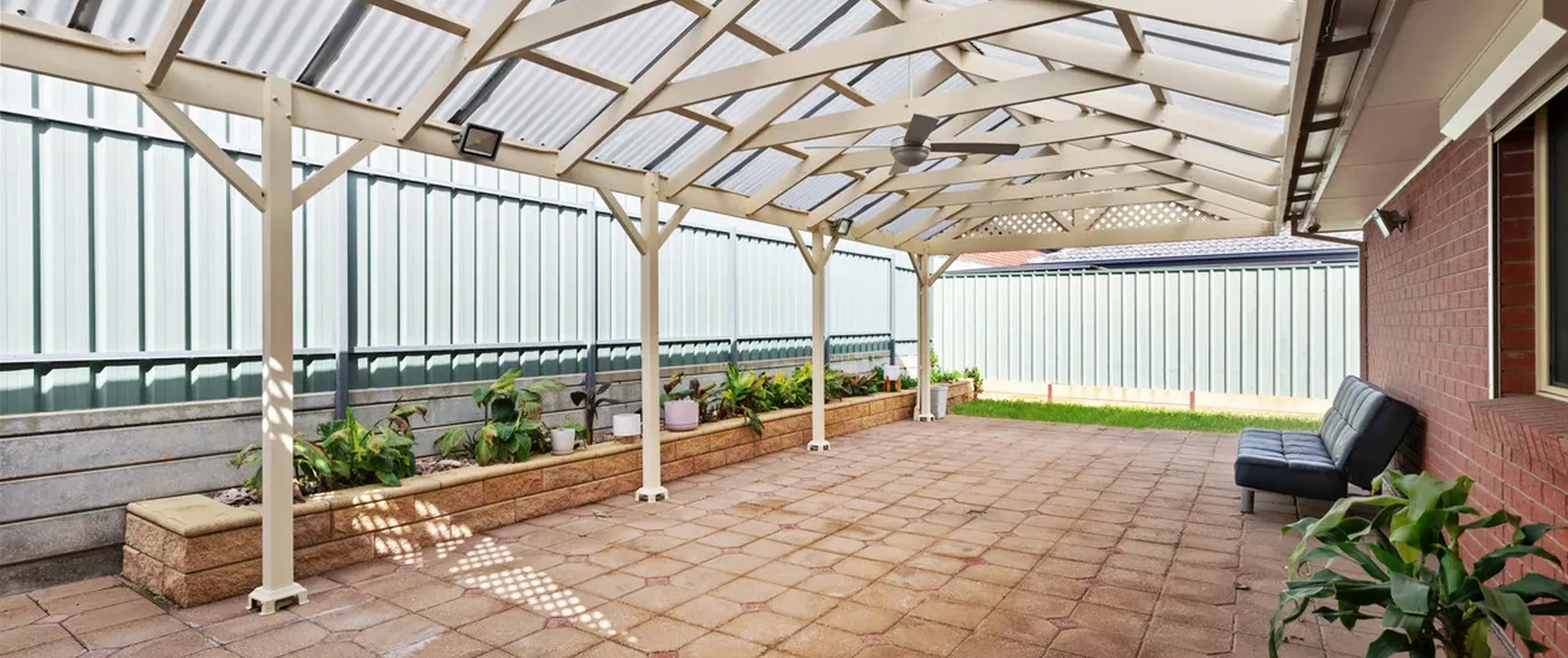 - Impressive outdoor entertaining area with ceiling fan