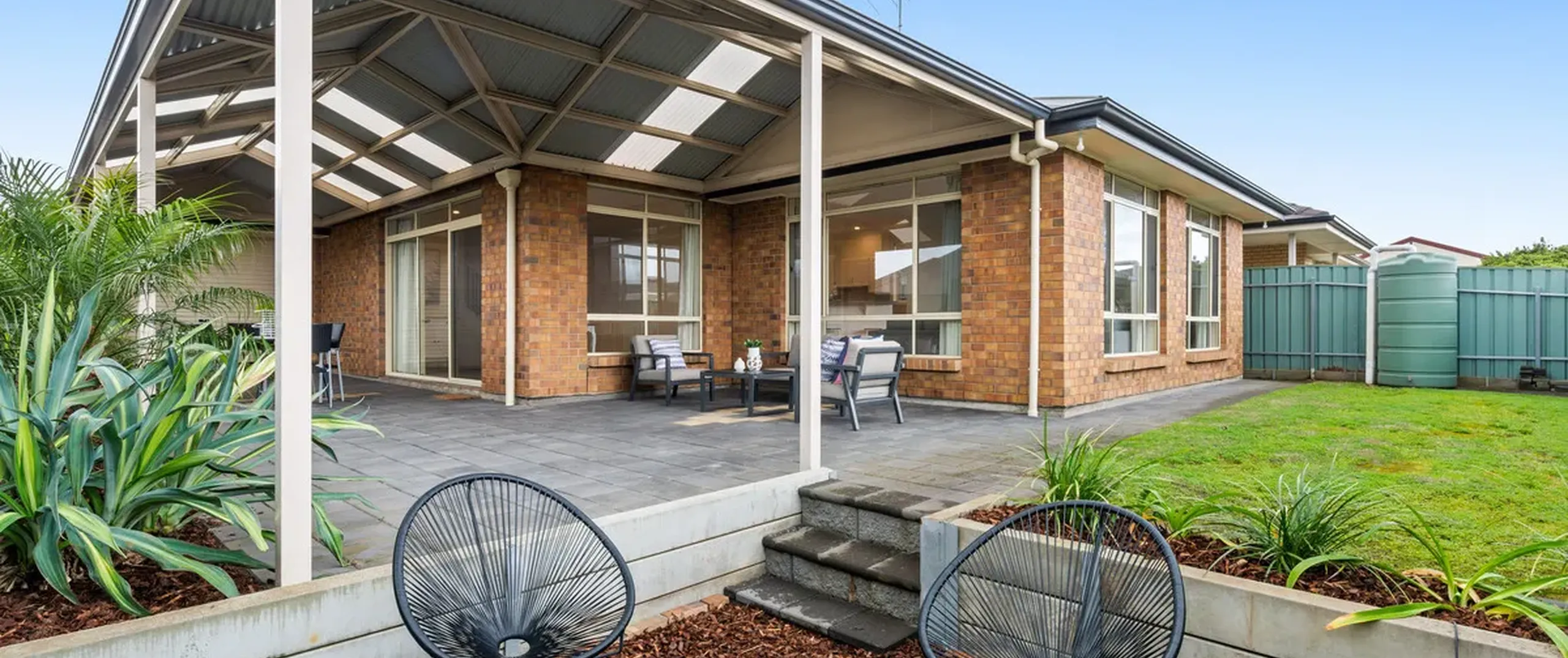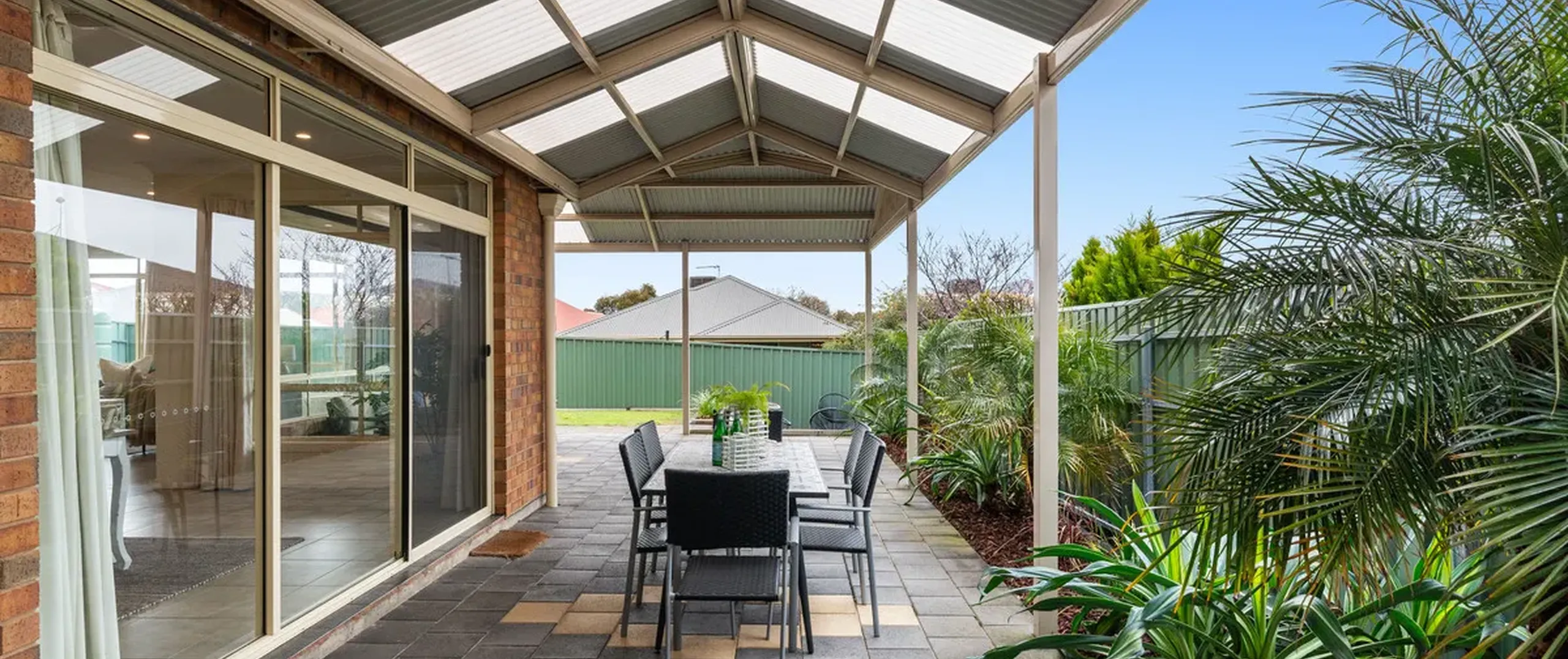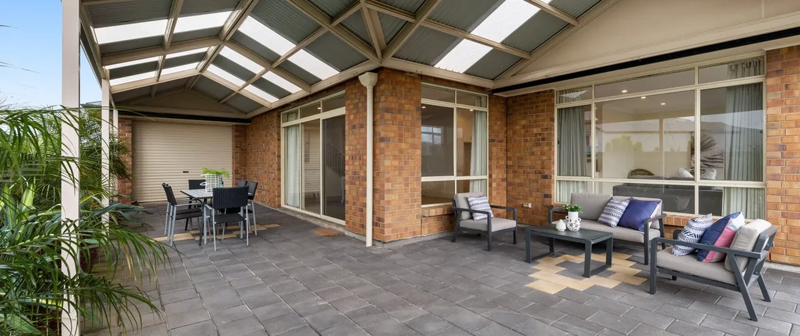 - Expansive paved pergola with pitched roof, perfect for outdoor entertaining