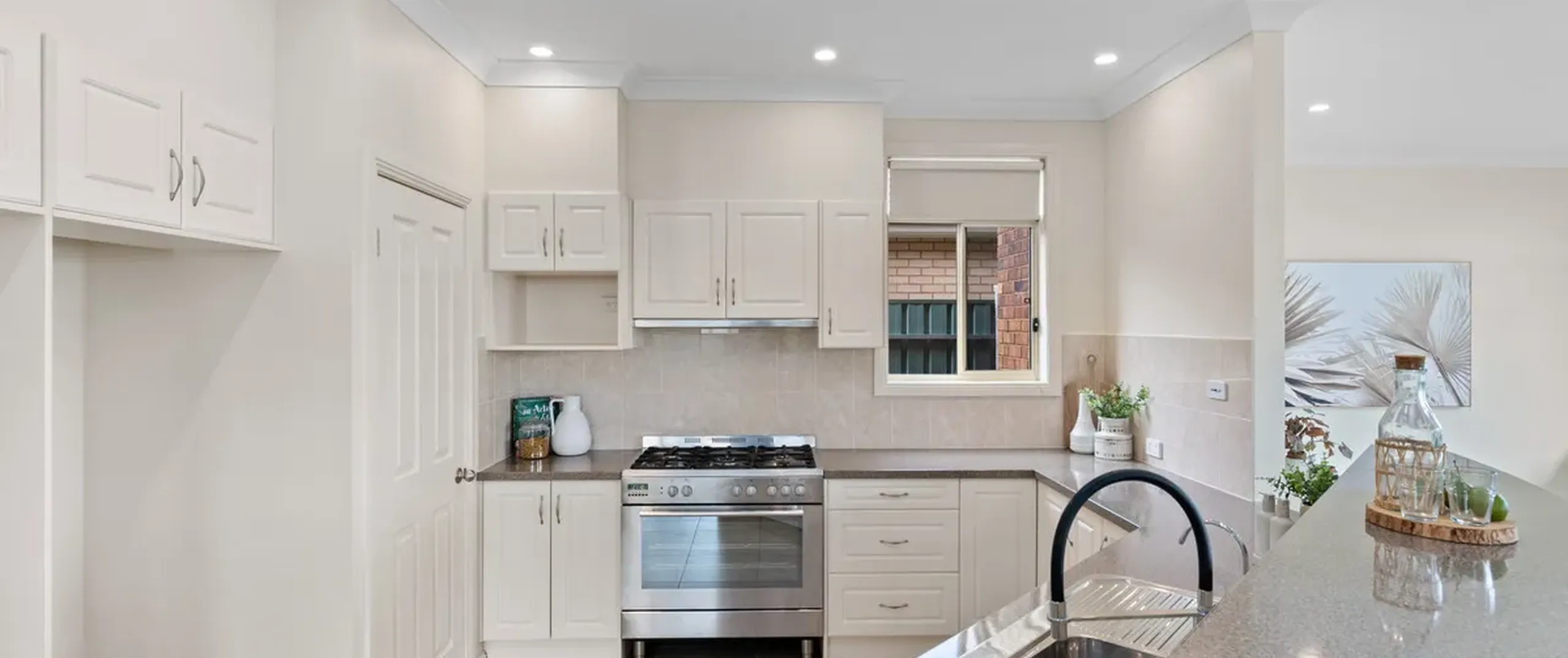 - Inviting kitchen with ample bench and storage space, stainless steel appliances including 900mm standalone gas cooktop and oven, dishwasher and walk-in pantry