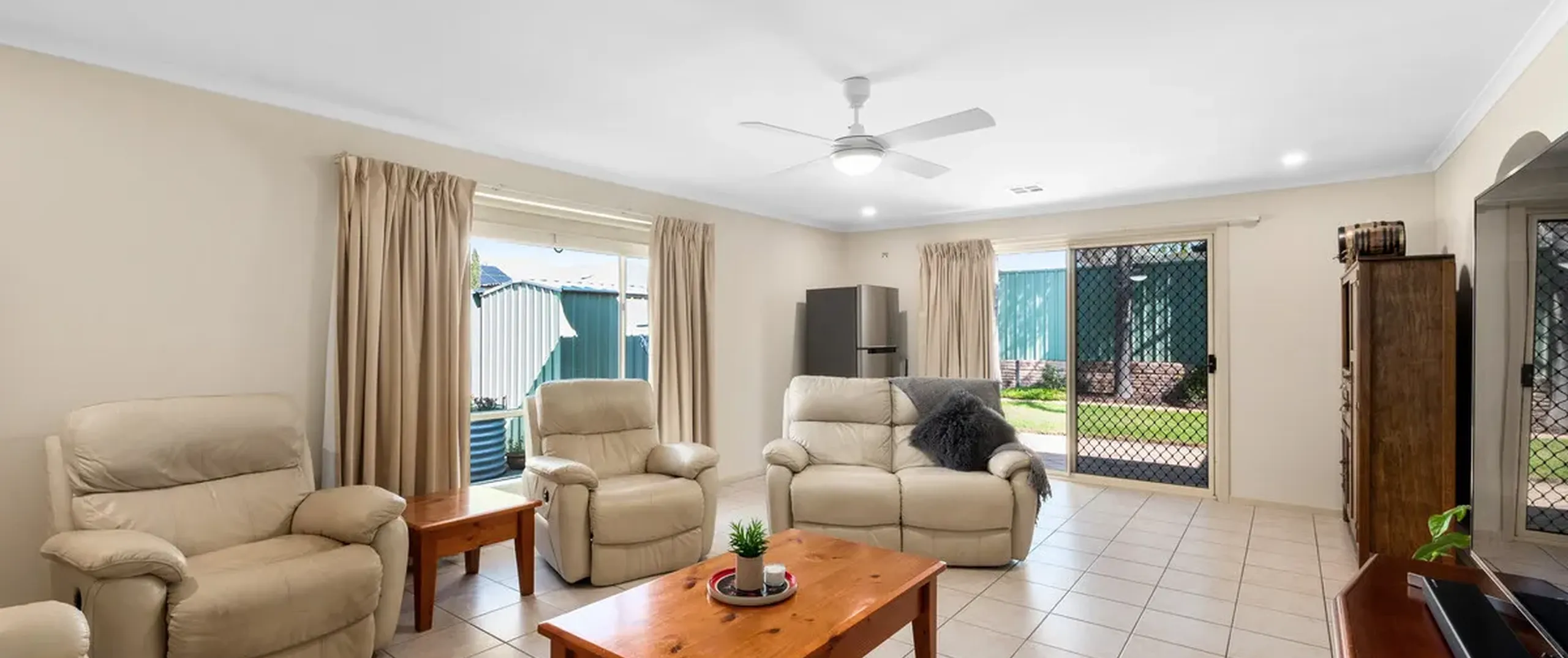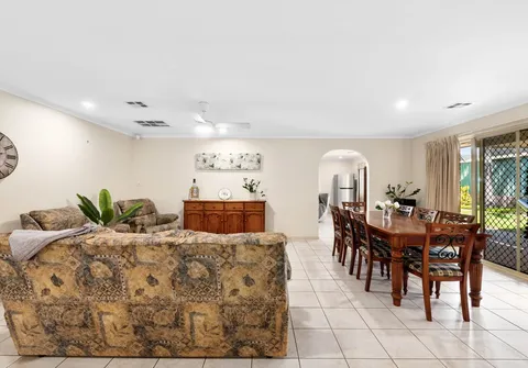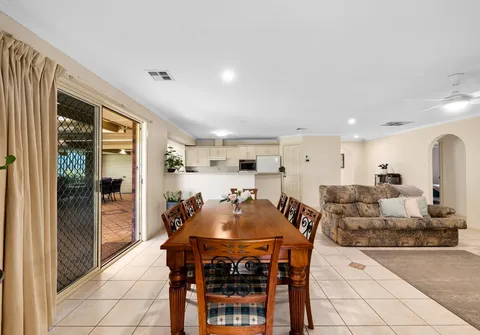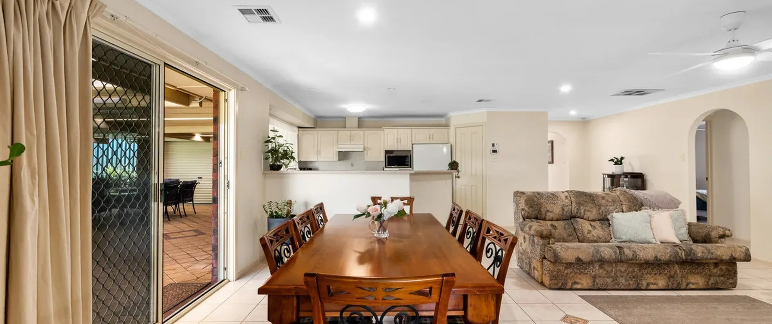 - Open plan kitchen, living and meals area with ceiling fans and views over the rear yard
