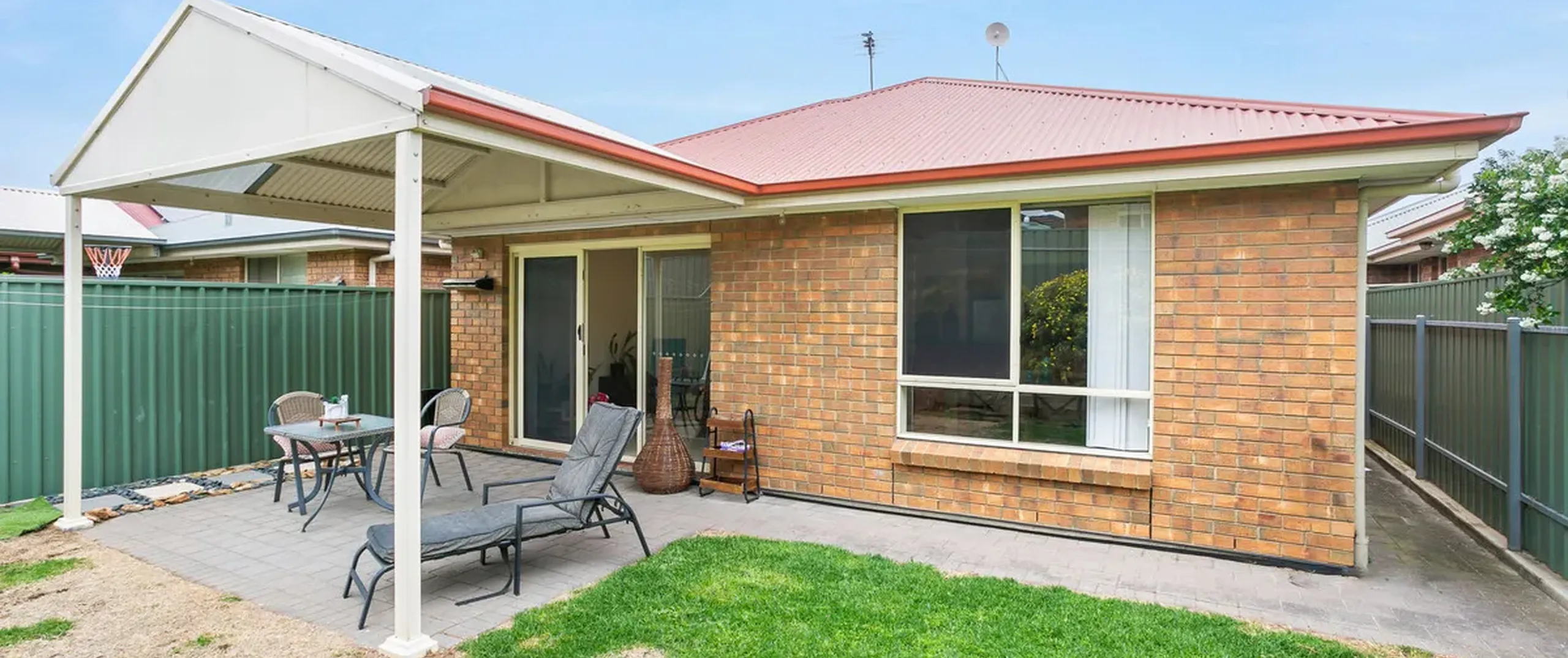- Paved outdoor area with pitched roof pergola, perfect for entertaining while kids and pets enjoy the low-maintenance gardens