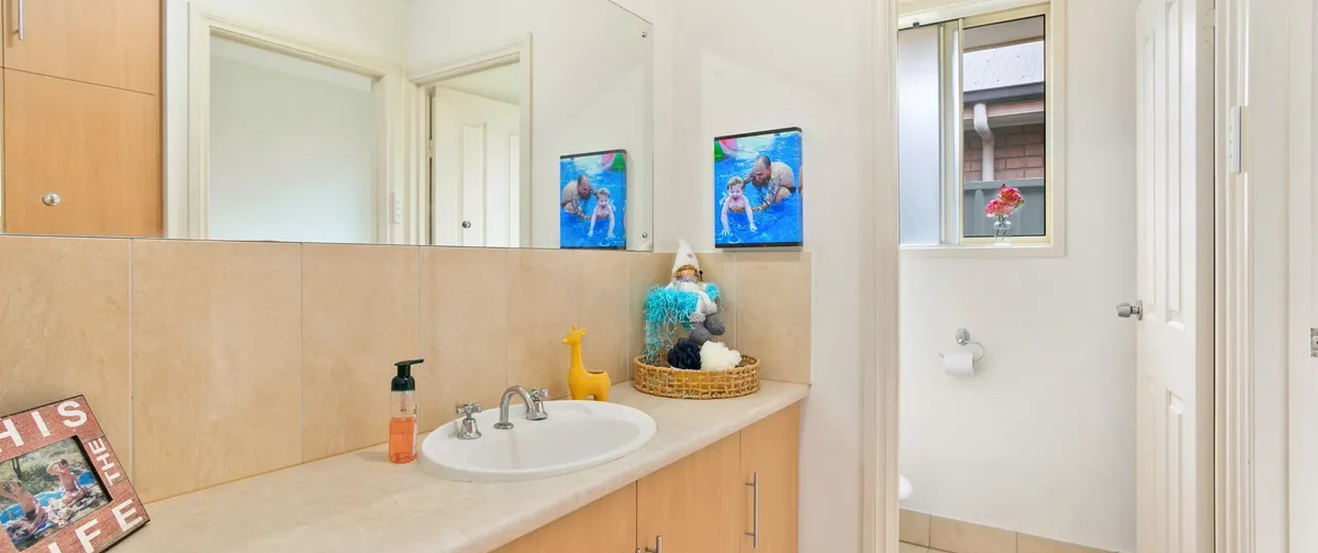 - Three-way main bathroom centrally located with powder room, bath and shower