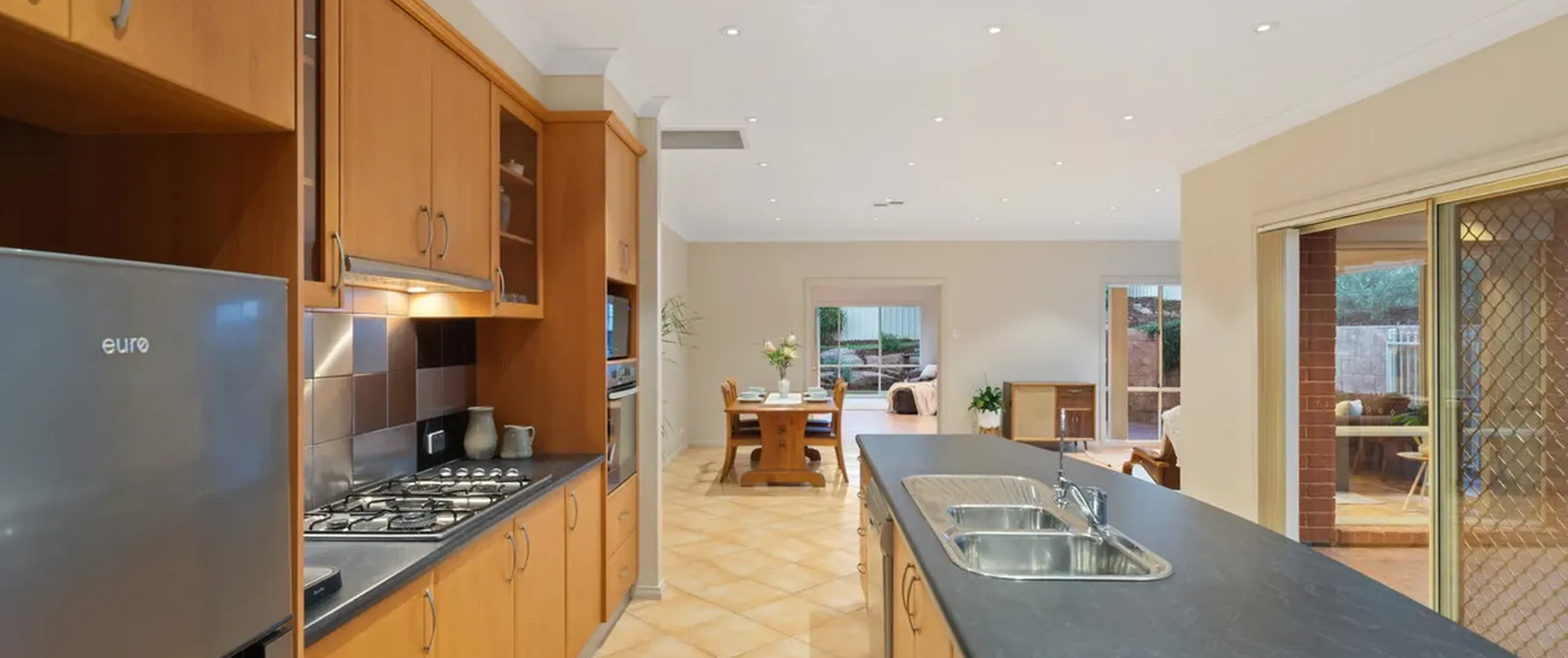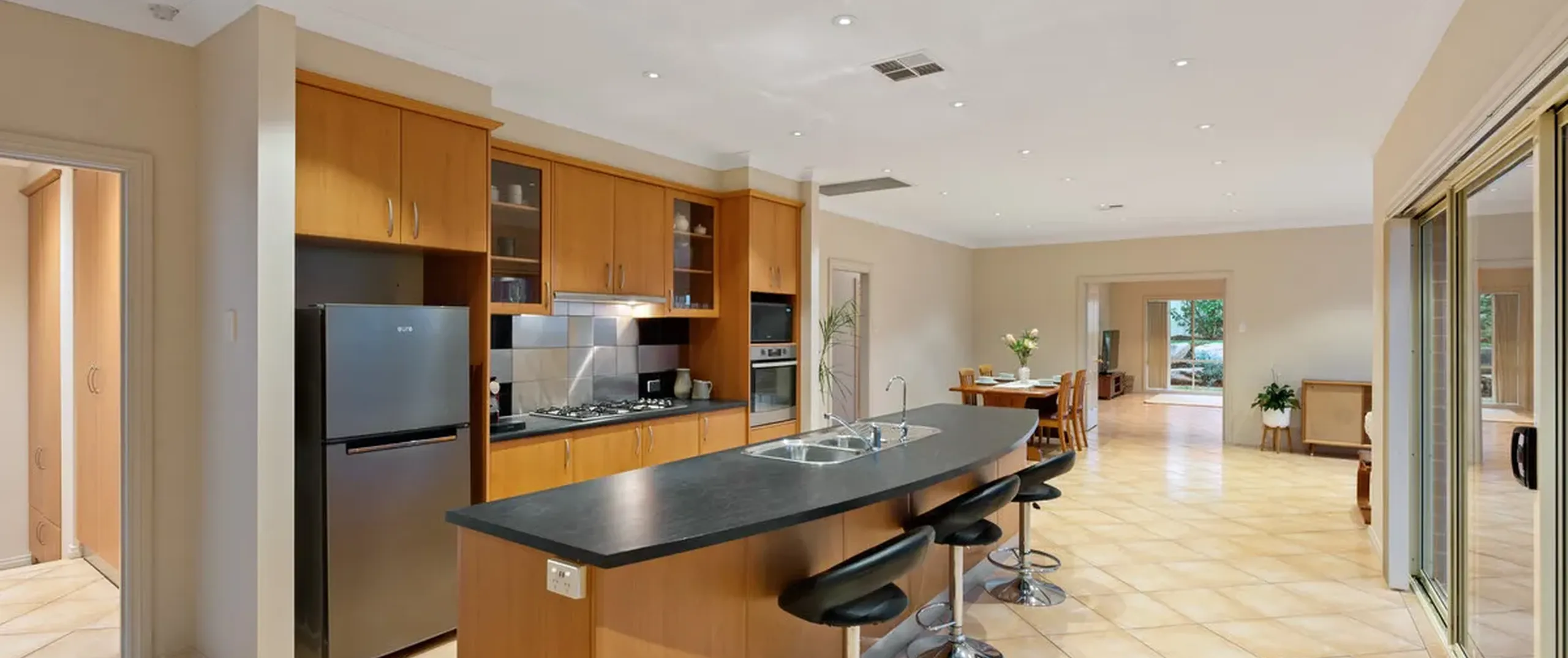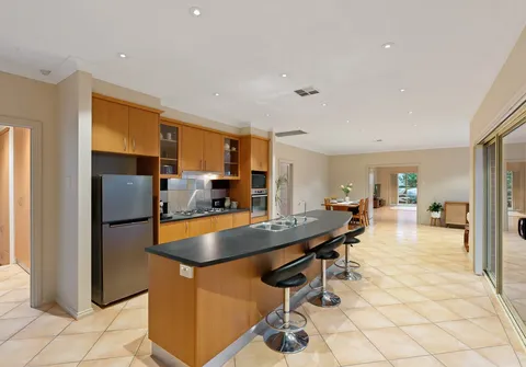 - Commodious kitchen with stainless-steel dishwasher, wall oven and gas cooktop, huge walk-in pantry and complete with an abundance of cupboard space and island bench with breakfast bar