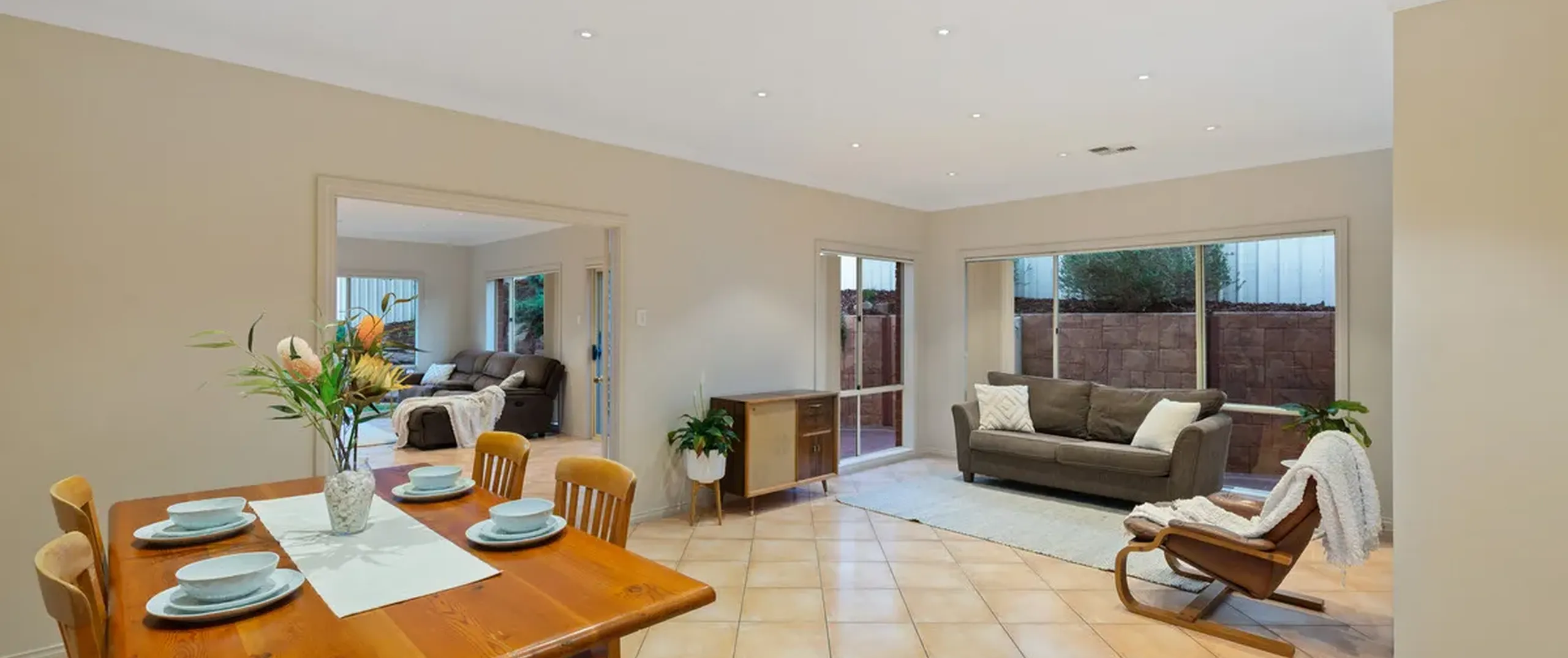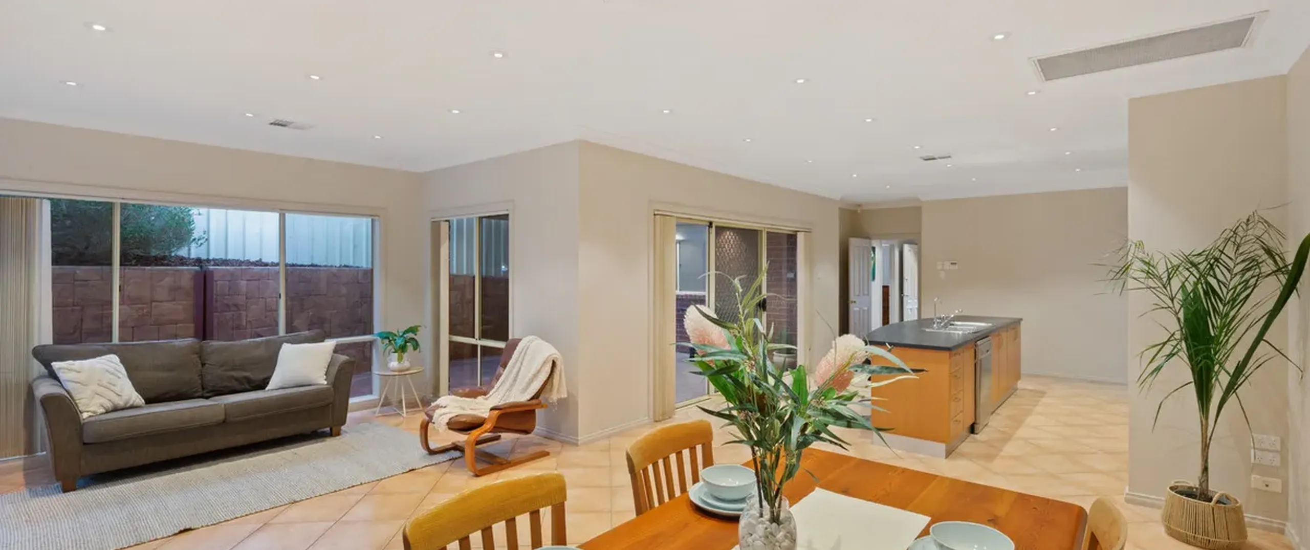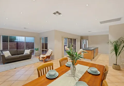 - Large open-plan tiled kitchen, family and dining room with sliding doors opening to the outdoor entertaining area