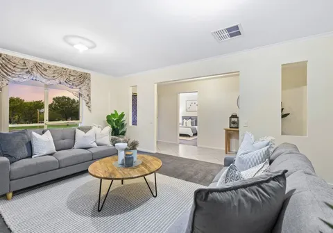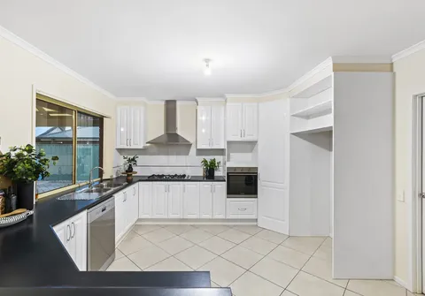 A striking stone-fronted bay window facade and elegant coffered ceiling entranceway set the stage for the residence's sleek and contemporary styling. Guests may be formally received in the lounge room upon entering with seamless flow through to the open-spaced living and dining room. The centrepiece, a dream kitchen is sure to be the hub of daily life, exciting the home chef with its sweeping benchtops, gas cooktop, dishwasher and ample storage.