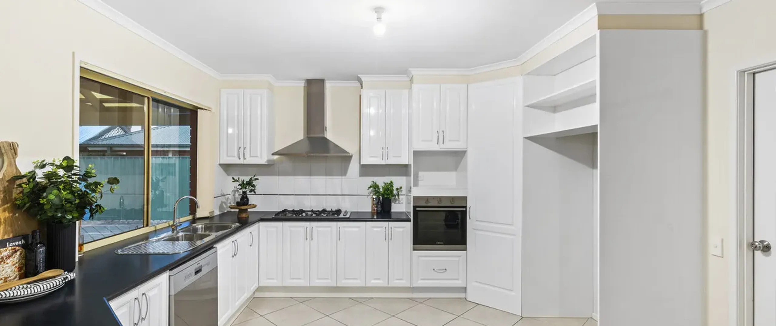 - Charming white kitchen with stainless steel dishwasher and gas cooktop, abundance of cupboard storage and sweeping benchtops
