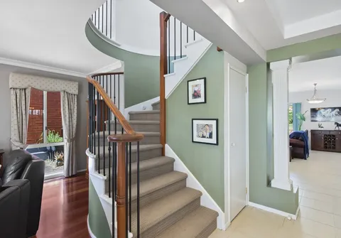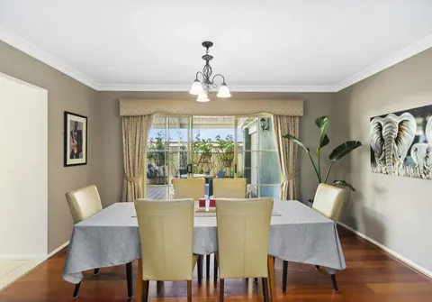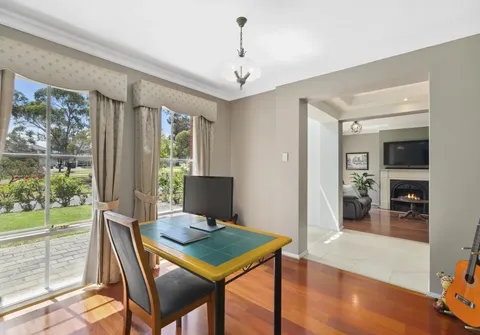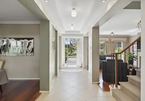 The entrance sets a remarkable tone with a statement staircase and high coffered ceilings. Follow the gleaming tiles that lead you to the elegant formal lounge with a beautiful fireplace, a home office, and a formal dining area. From here, you are welcomed into an inviting open-plan kitchen, family, and meals space. The spacious kitchen ensures that even the most dedicated cook feels perfectly at home, boasting quality appliances and sweeping countertops.