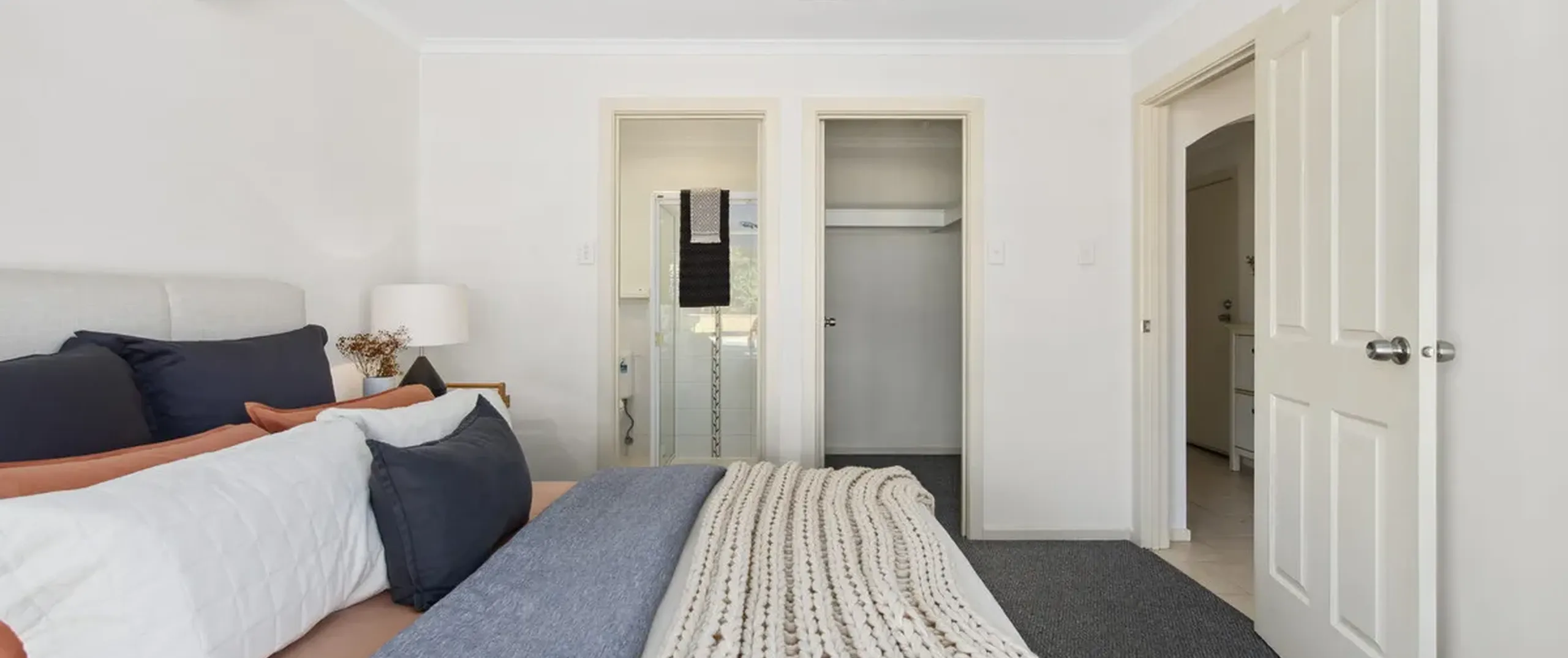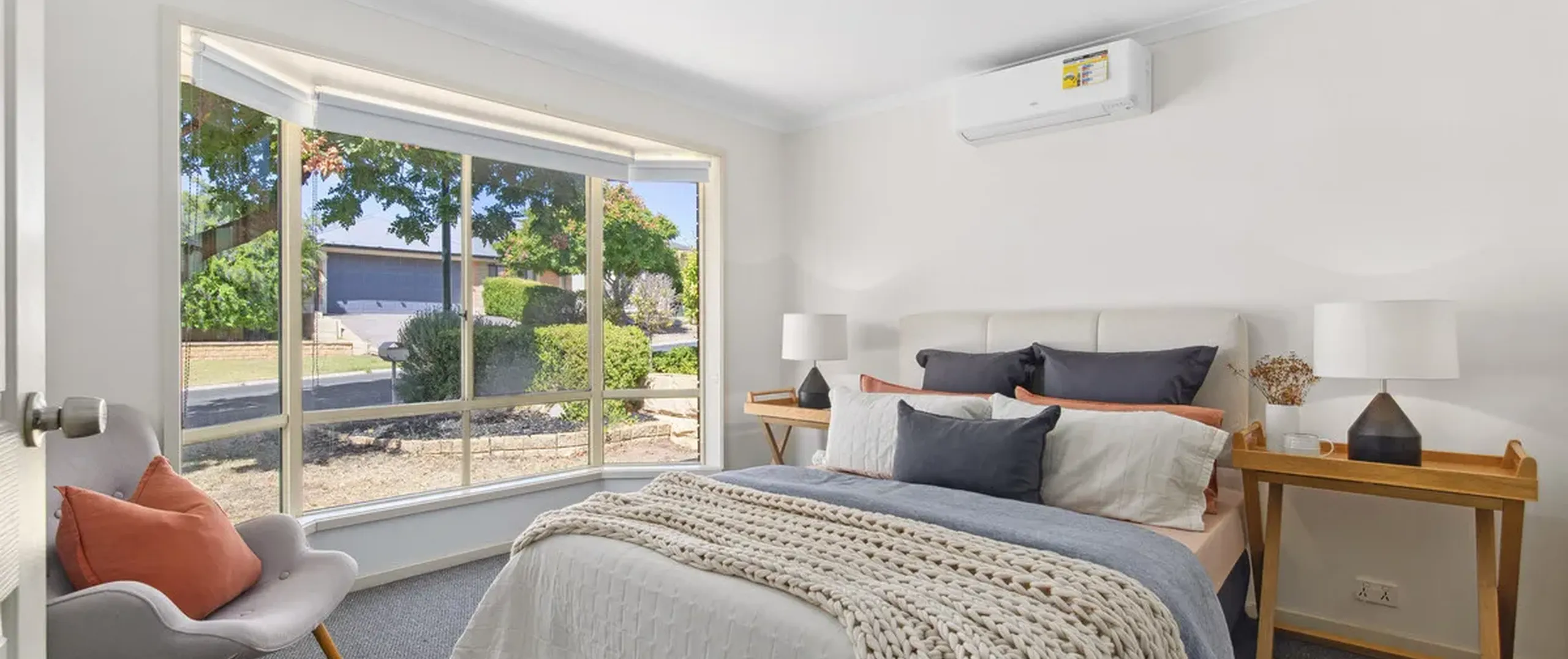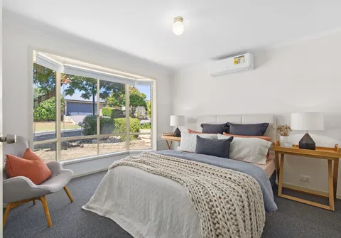 - Master bedroom with natural light through the charming bay window, a walk-in robe, ensuite and split-system air-conditioner