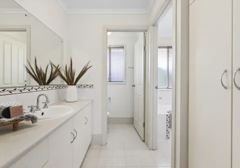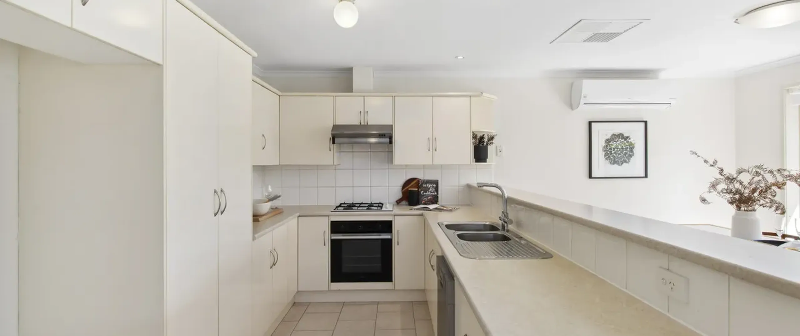 - Timeless white kitchen with ample storage space, sweeping bench tops, gas cooktop and dishwasher