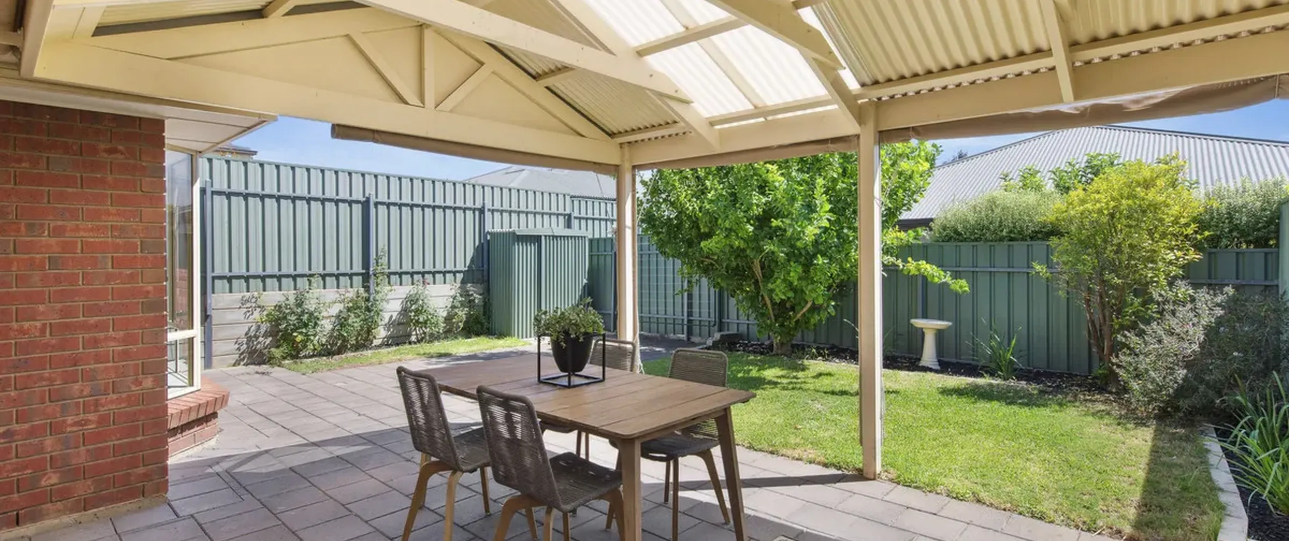 - Outdoor entertaining courtyard with pitched roof pergola, overlooking the lawn and low-maintenance garden