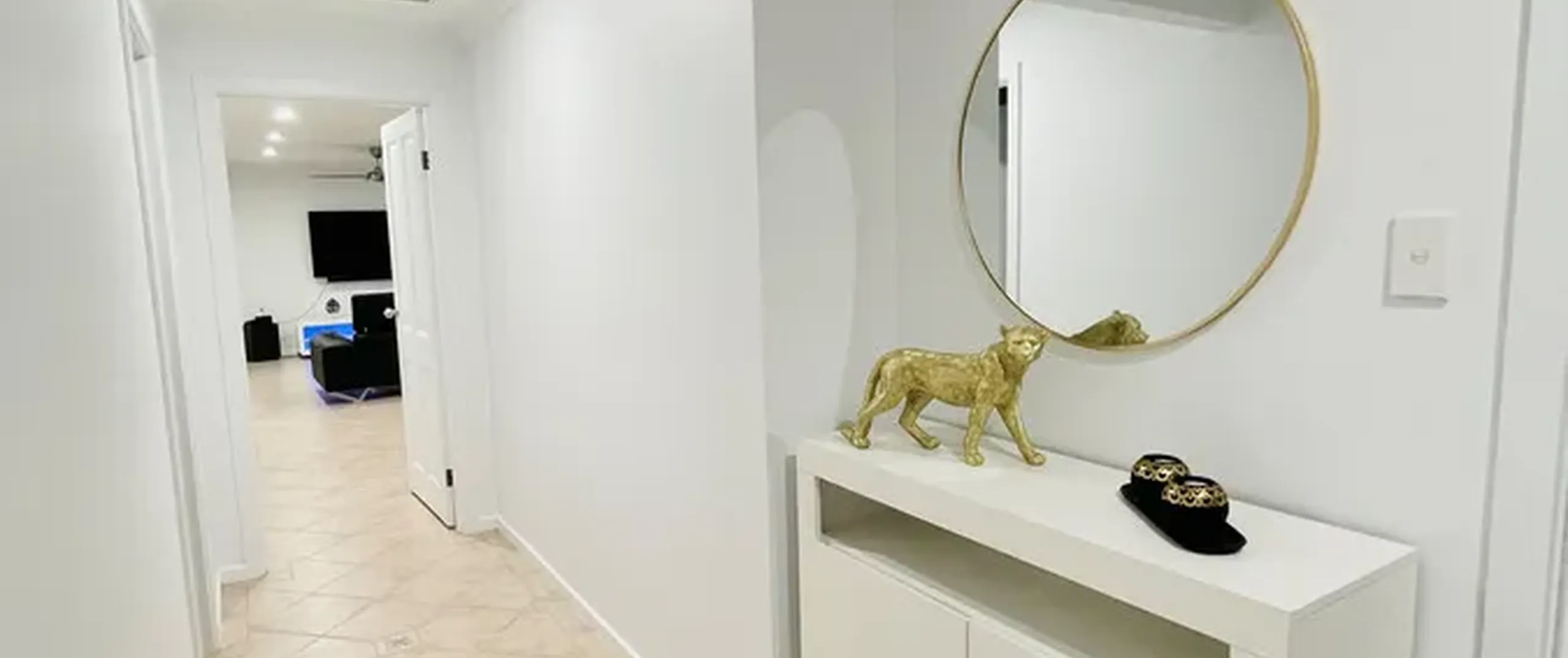 - Wide entryway leading to the lounge room with a recessed ceiling and beautiful bay window