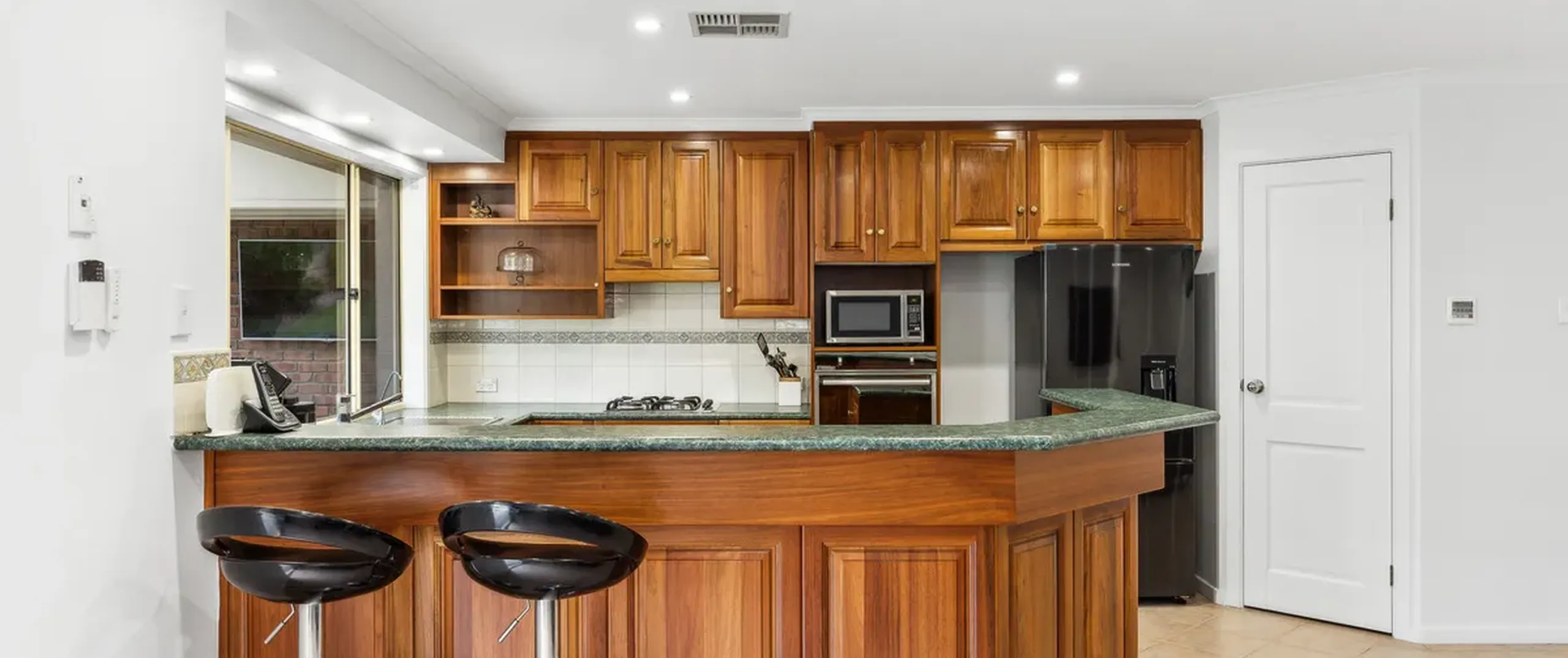 - Traditional timber-style kitchen with a walk-in pantry, dishwasher, and gas cooktop
