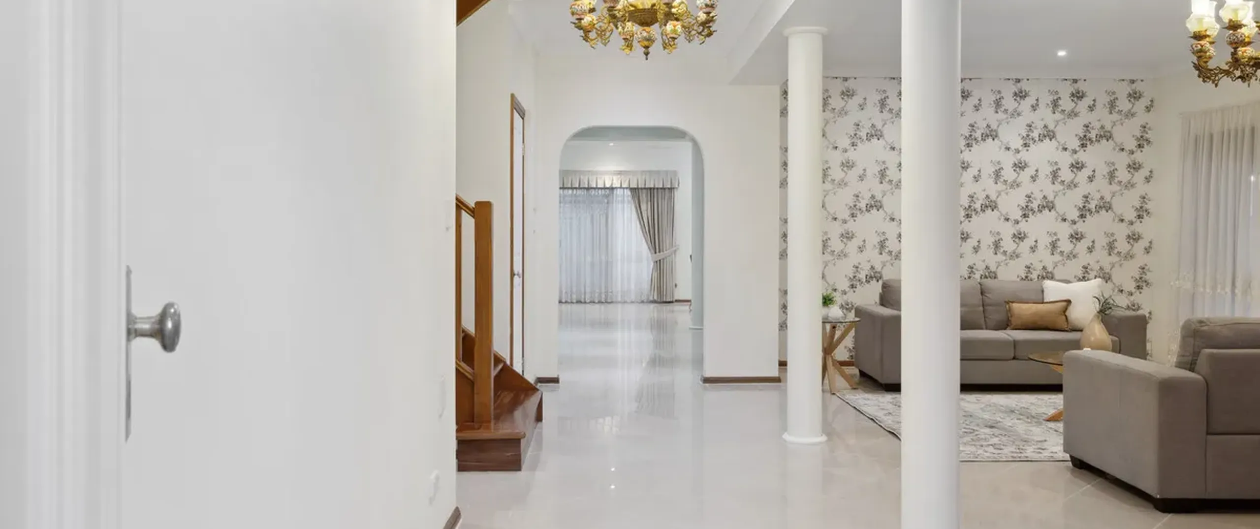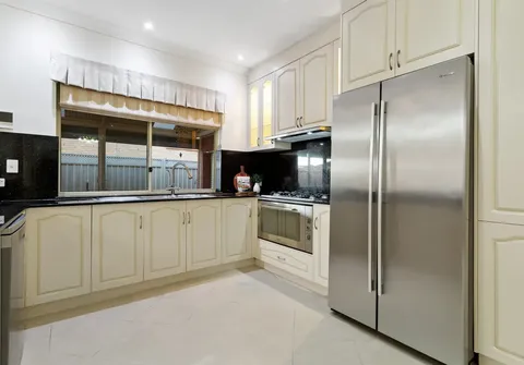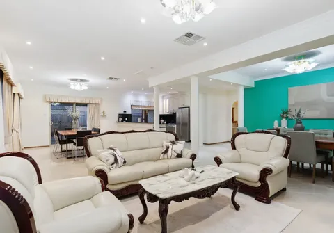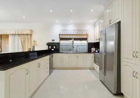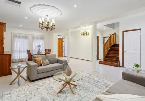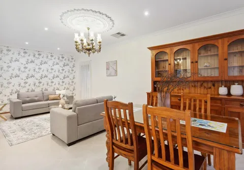 The entryway sets a remarkable tone with ceiling roses and a charming pendant light, leading you through gleaming tiles to the elegant formal lounge. Beyond, the open-plan kitchen, family, and meals area invites you in, where the spacious kitchen delights with ample storage and expansive countertops to satisfy even the most dedicated home chef.
