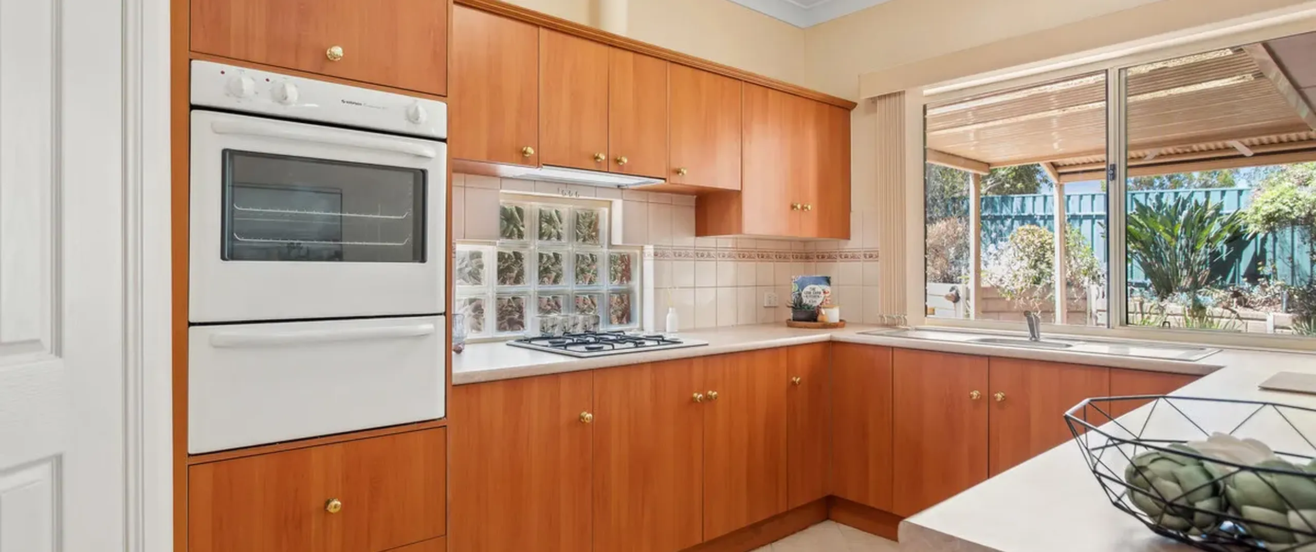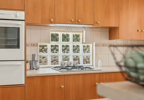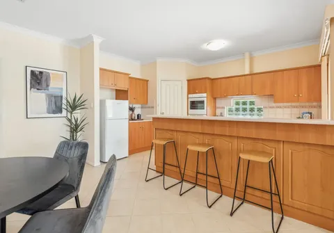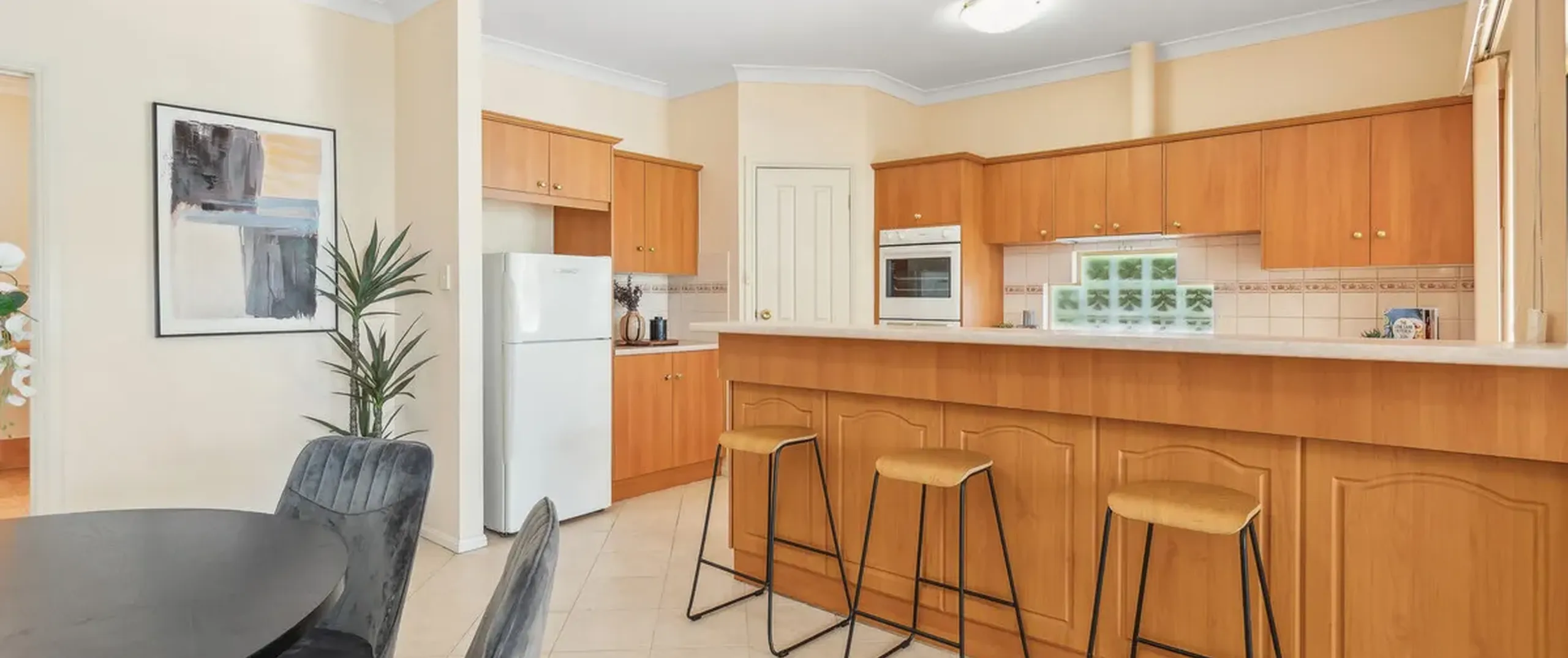 - Timeless timber-look kitchen featuring gas cooktop, dishwasher, breakfast bar and ample bench and cupboard space