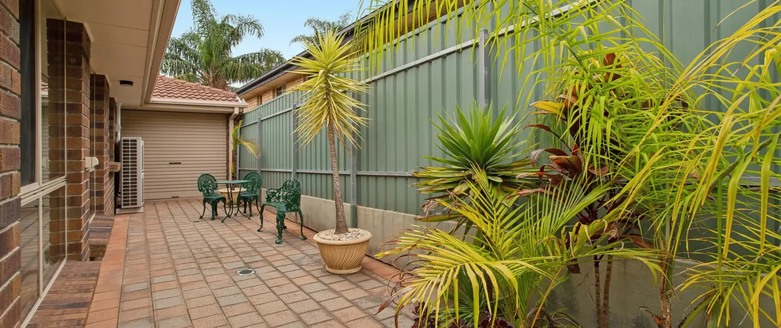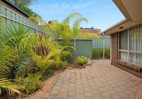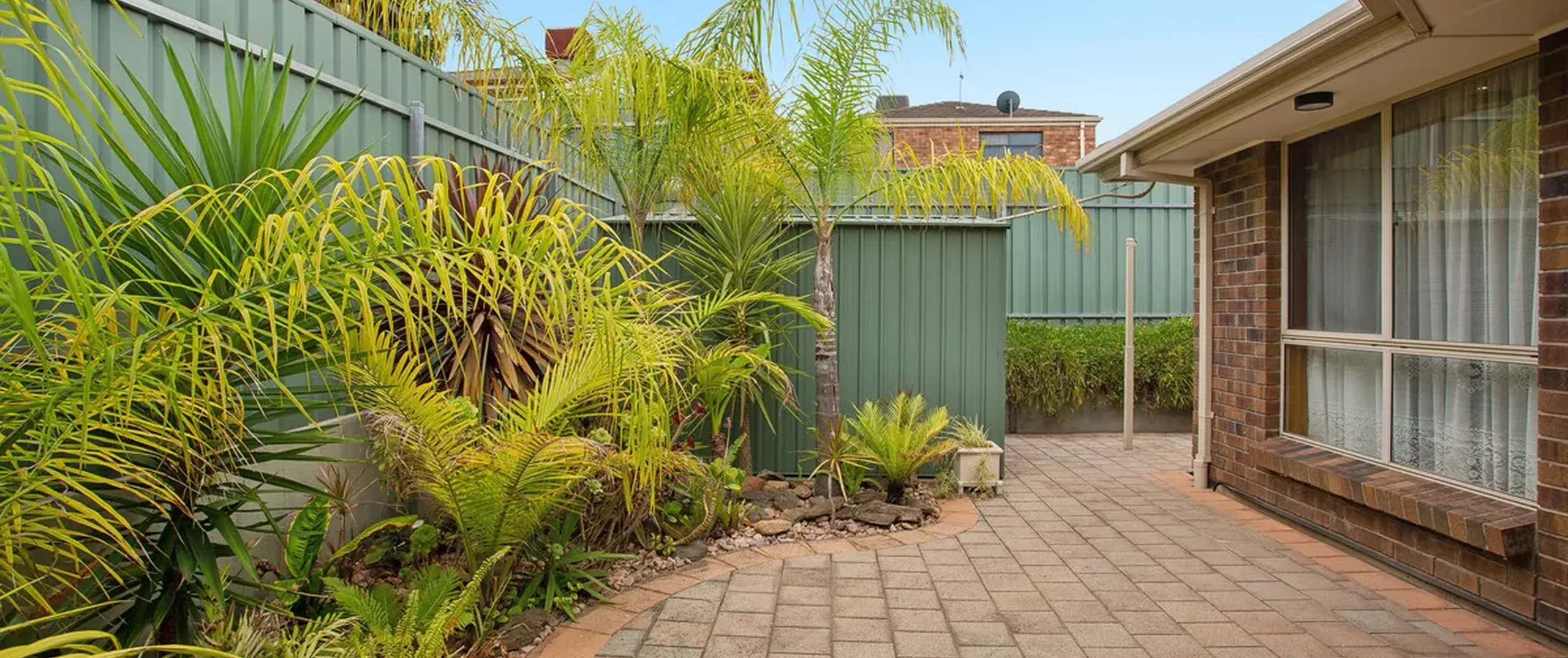 Outside, the low-maintenance yard features a paved courtyard surrounded by an established garden bed. A garden shed provides additional storage, while the outdoor space offers the perfect canvas to create your personal oasis.