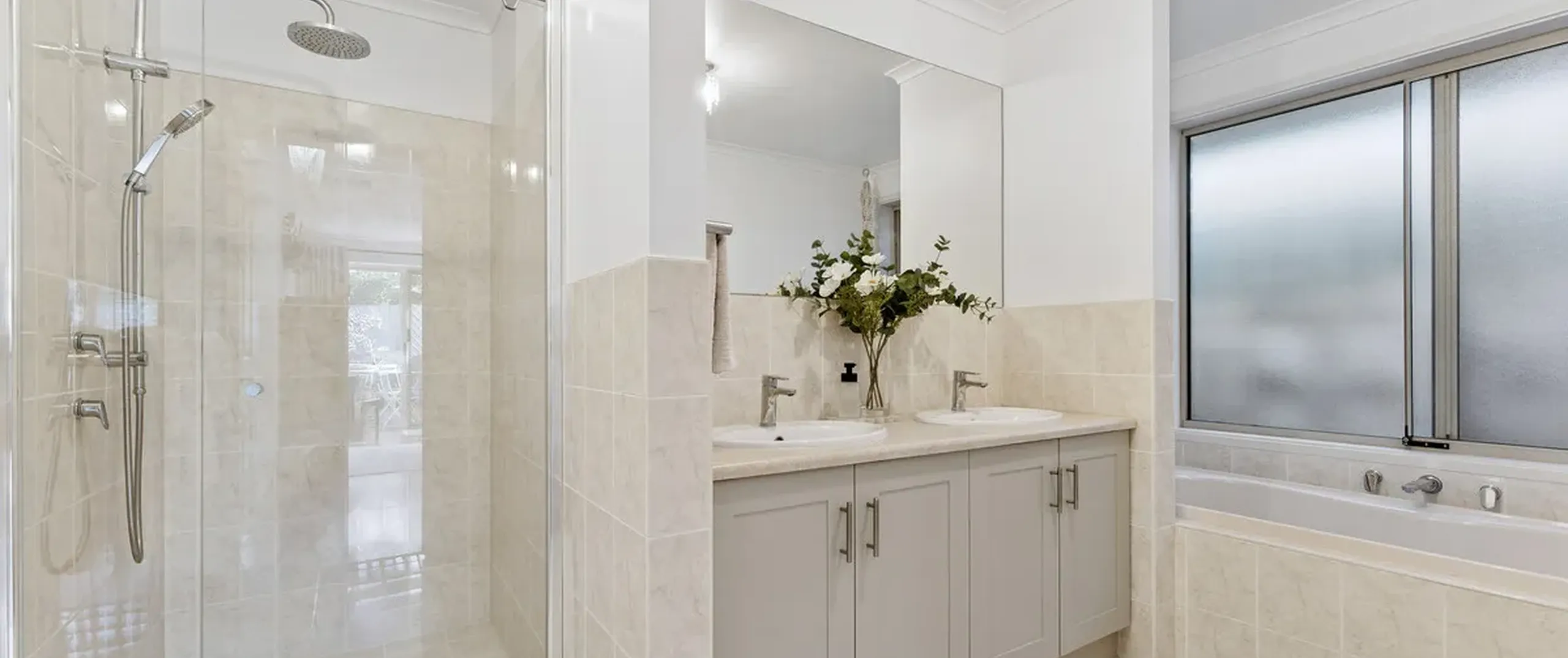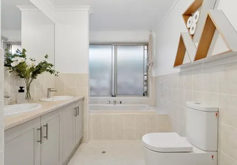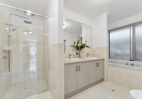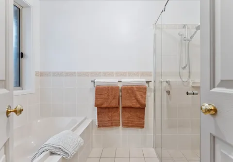 - A master suite with spacious walk-in robe, private ensuite with separate bath and shower, dual sinks, ceiling fan and sliding door access to the fenced outdoor deck